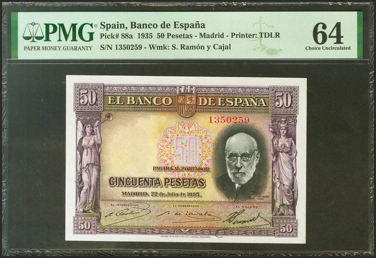 50 Pesetas. 22 de Julio de 1935. Sin serie. (Edifil 2021: 366, Pick: 88a). SC. Encapsulado PMG64.