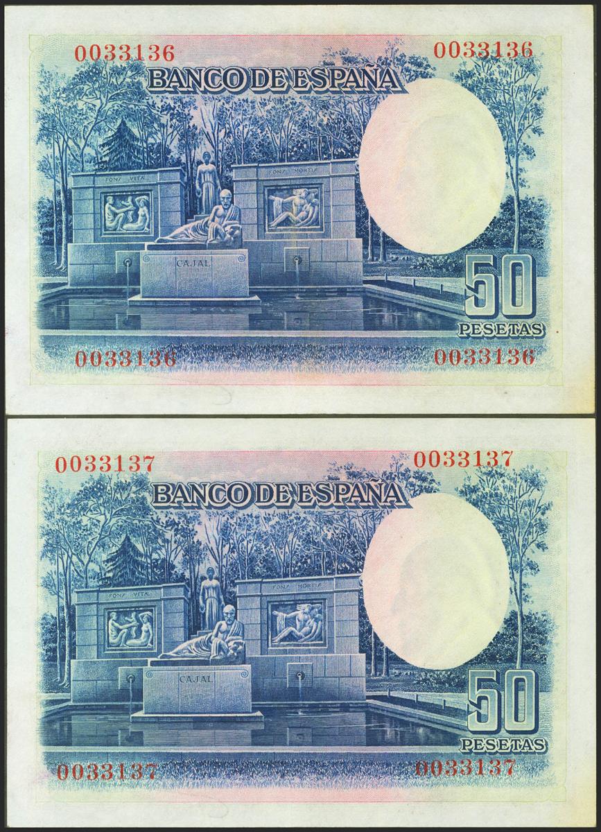 50 Pesetas. 22 de Julio de 1935. Pareja correlativa. Sin serie. (Edifil 2021: 366). Conserva gran parte del apresto original. EBC.
