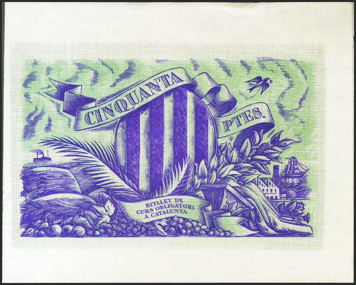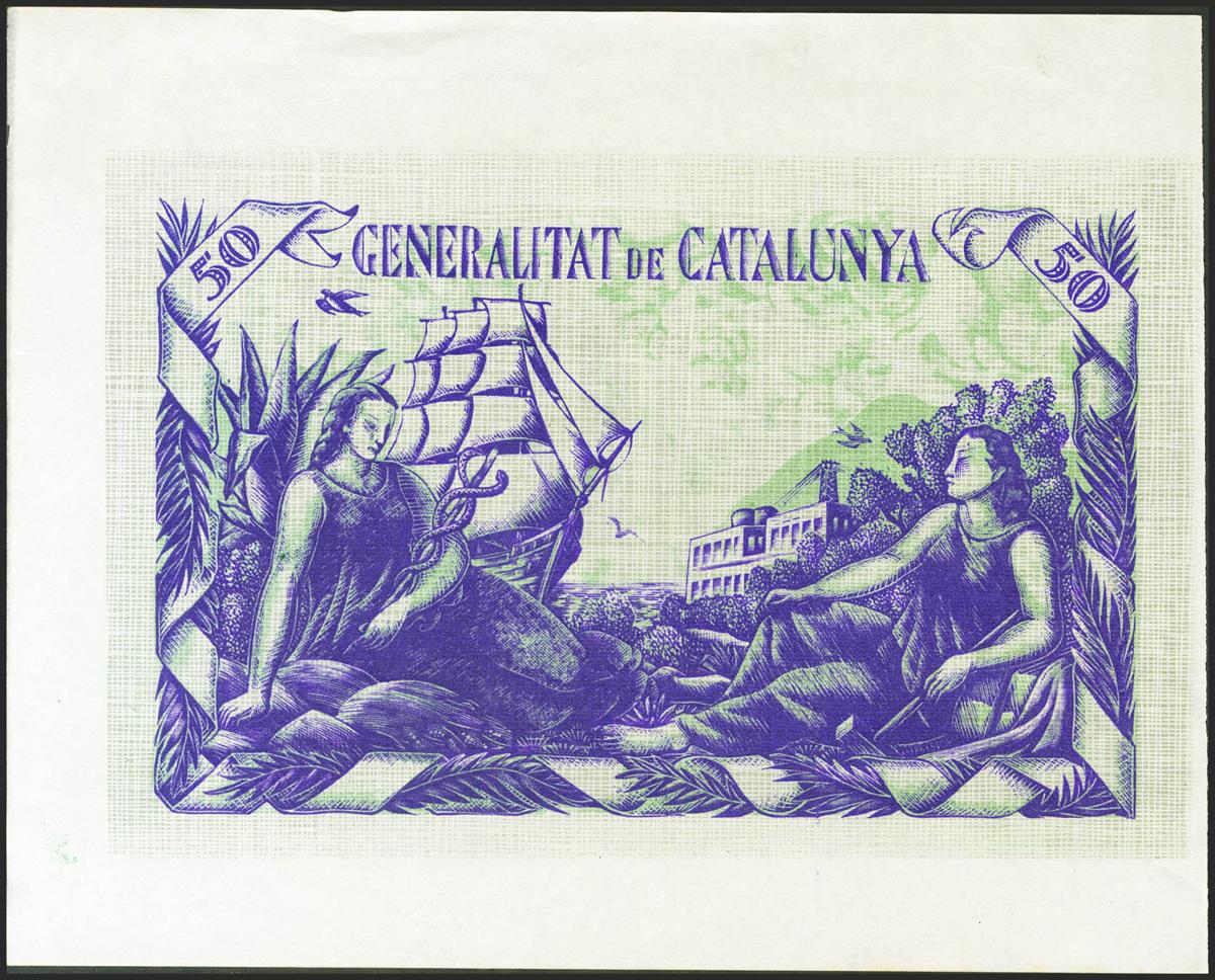 Prueba de un billete no emitido de la Generalitat de Catalunya de 50 Pesetas, fechado el 1 de Septiembre de 1940, de la emisión de 25 de Septiembre de 1936. SC-.