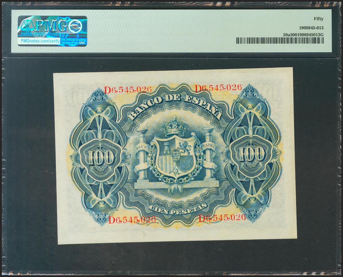 100 Pesetas. 30 de Junio de 1906. Serie D, última serie emitida. (Edifil 2021: 313a, Pick: 59a). Inusual en esta calidad. EBC. Encapsulado PMG50.