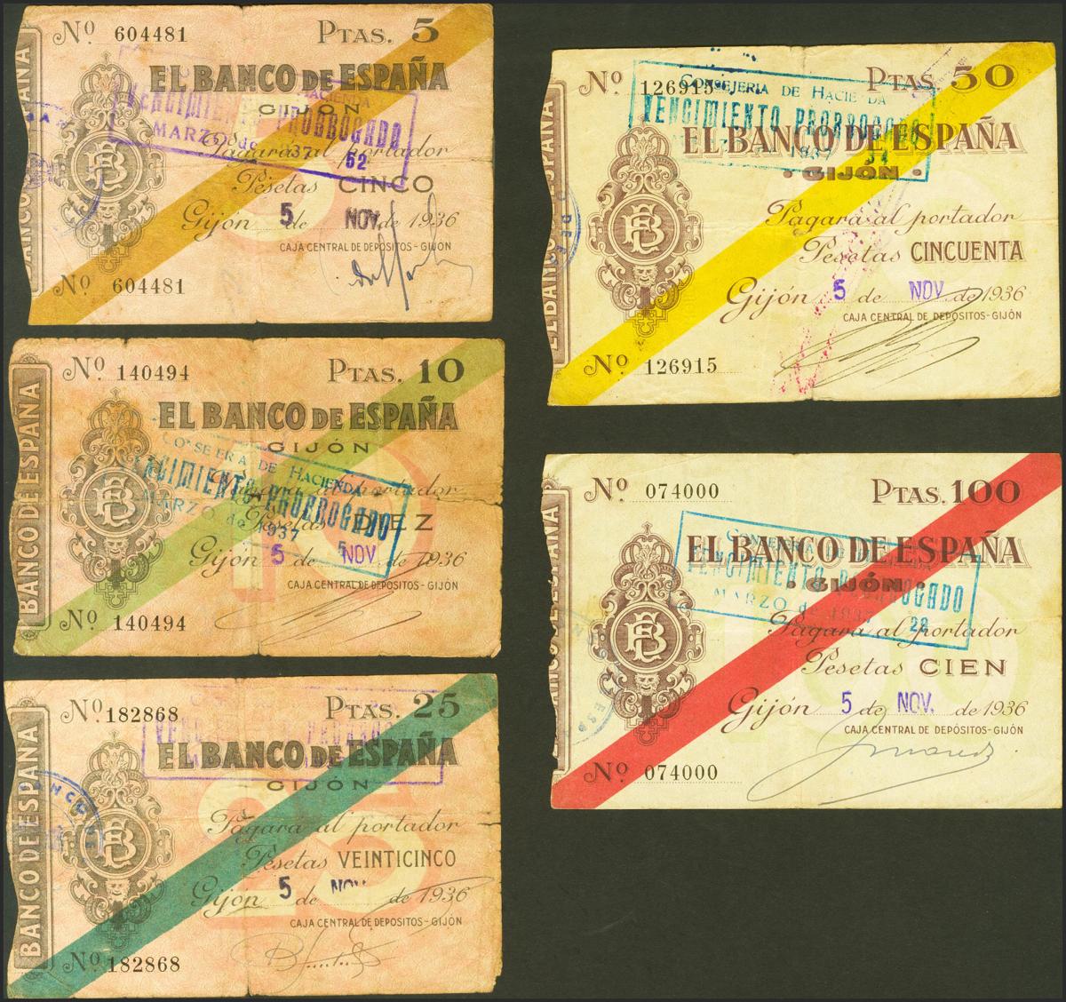 Conjunto de 5 billetes de 5 Pesetas, 10 Pesetas, 25 Pesetas, 50 Pesetas y 100 Pesetas emitidos por la sucursal de Gijón el 5 de Noviembre de 1936. (Edifil 2021: 380/84). MBC-/MBC+.