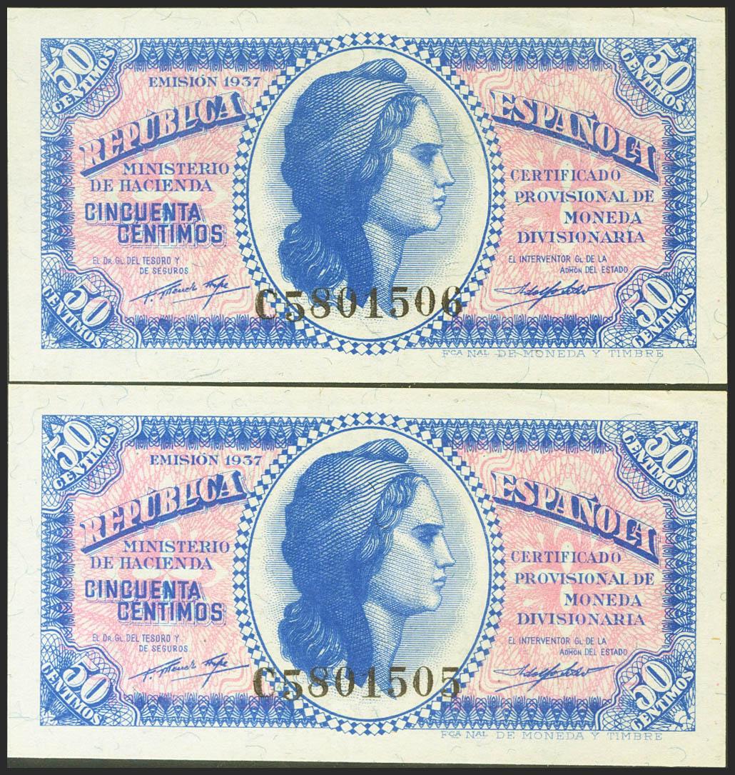 50 Céntimos. 1937. Pareja correlativa. Serie C, última serie emitida. (Edifil 2021: 391a). Apresto original. SC-.