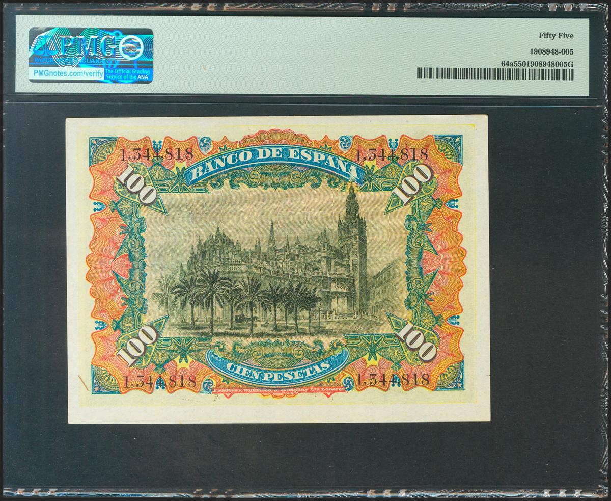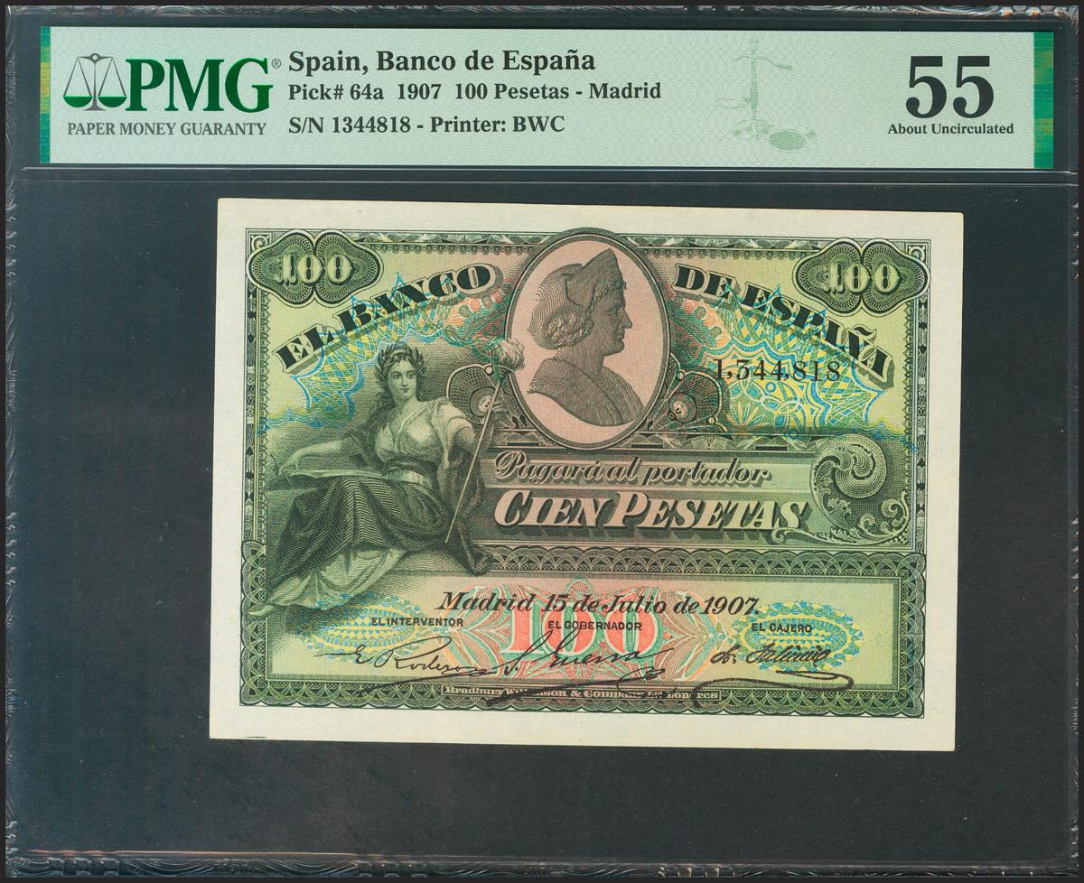 100 Pesetas. 15 de Julio de 1907. Sin serie. (Edifil 2021: 320, Pick: 64a). Inusual en esta calidad. EBC+. Encapsulado PMG55.