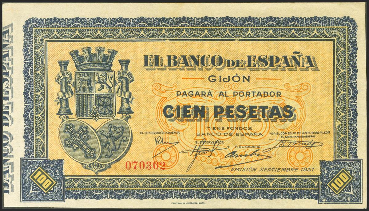 100 Pesetas. Septiembre de 1937. Banco de España, Gijón. Sin serie. (Edifil 2017: 399). SC-.