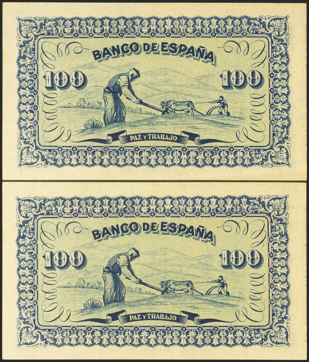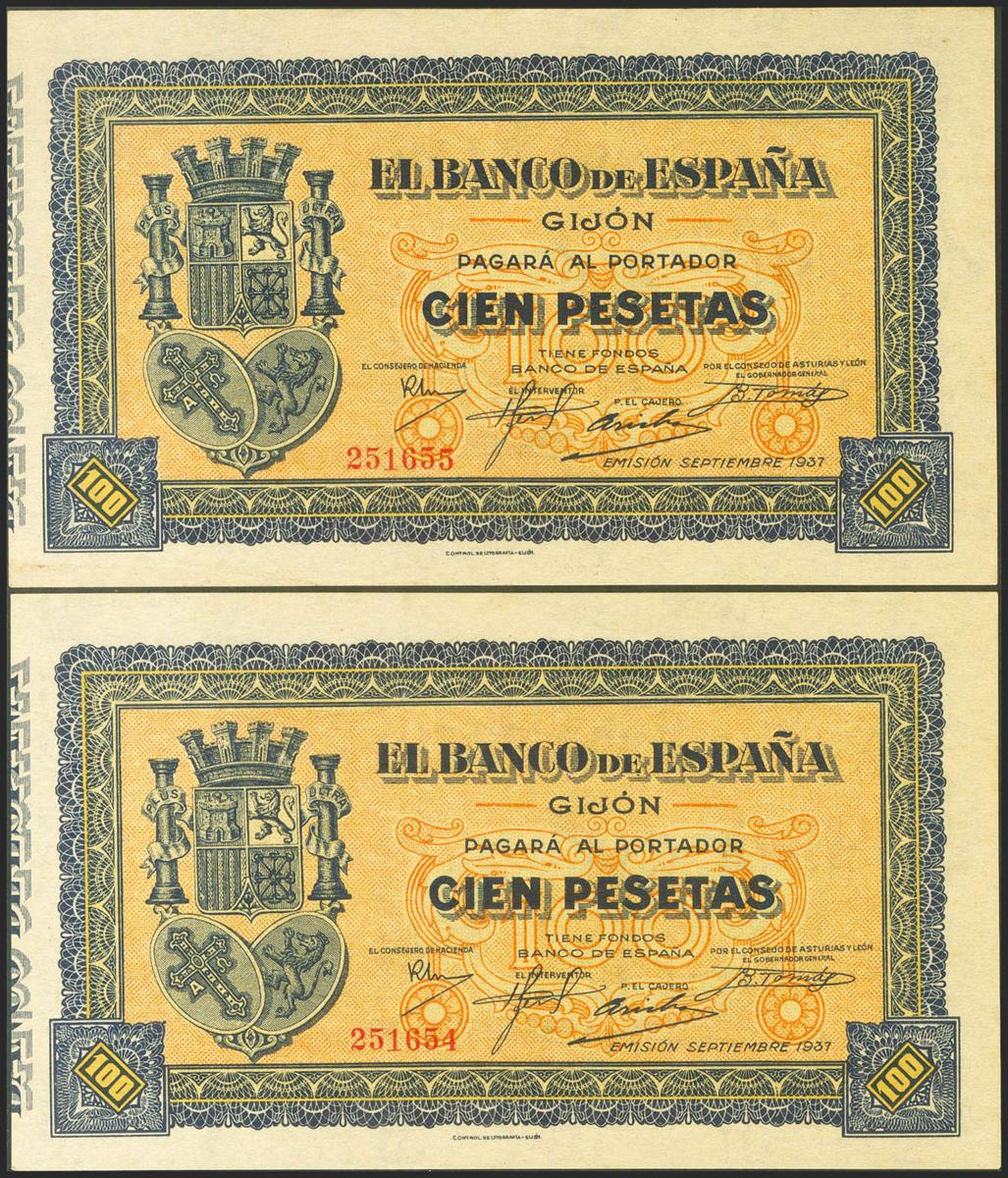 100 Pesetas. 1937. Pareja correlativa. Sucursal de Gijón. Sin serie. (Edifil 2021: 399). Apresto original. SC.
