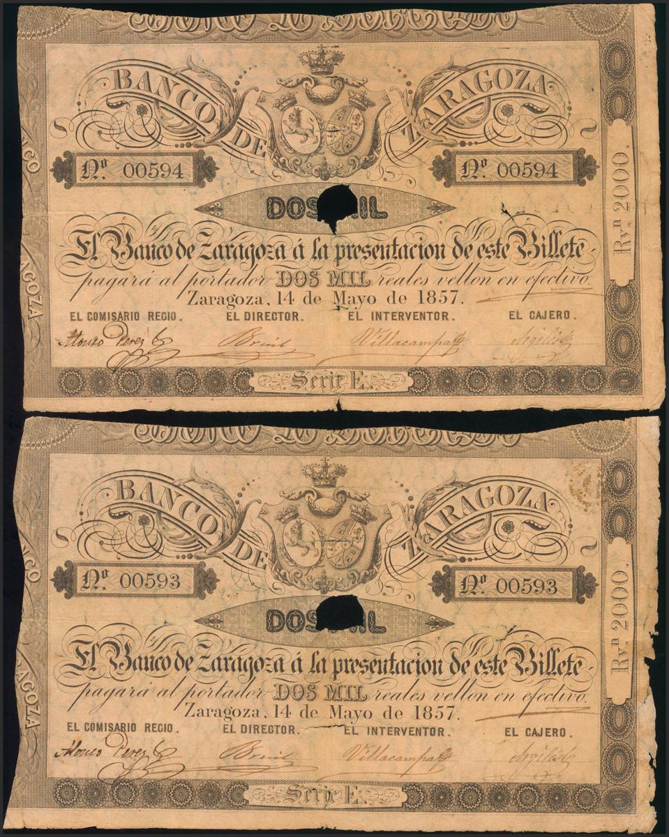 2000 Reales. 14 de Mayo de 1857. Banco de Zaragoza. Pareja correlativa. Serie E. Con taladro y sin firmas. (Edifil 2021: 130A). Raro. MBC+.