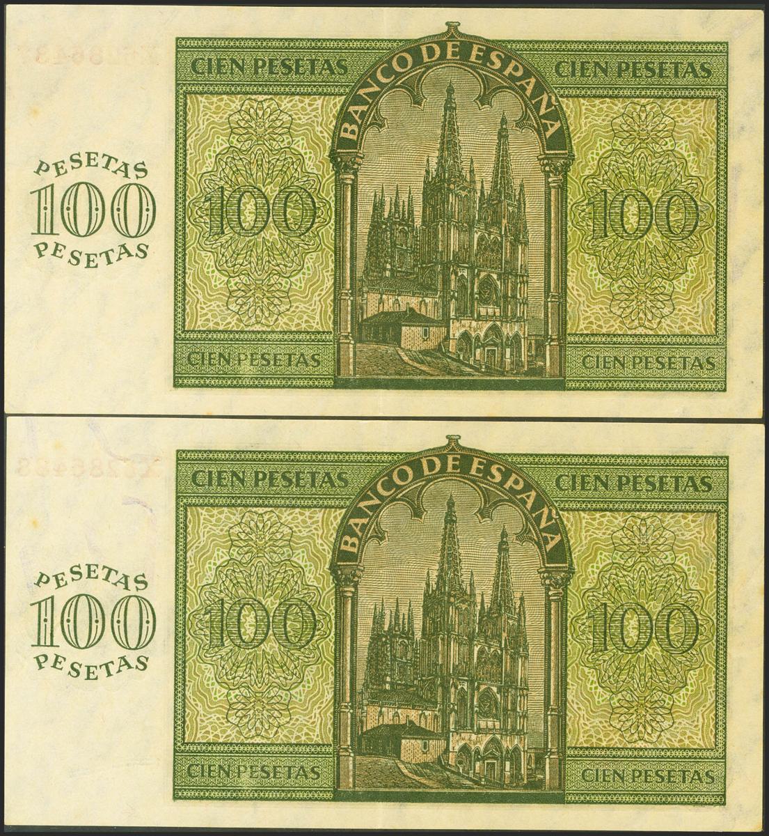 100 Pesetas. 21 de Noviembre de 1936. Pareja correlativa. Serie X, última serie emitida. (Edifil 2017: 421a). Conserva algo de apresto original. EBC+.