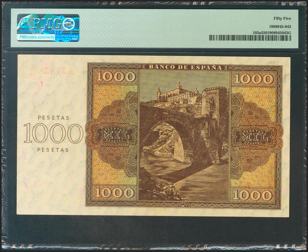1000 Pesetas. 21 de Noviembre de 1936. Serie A. (Edifil 2021: 423, Pick: 103a). Rarísimo en esta calidad. EBC+. Encapsulado PMG55.