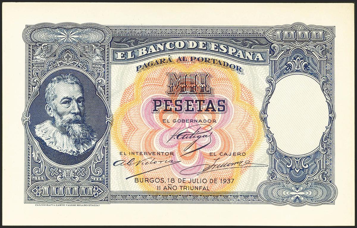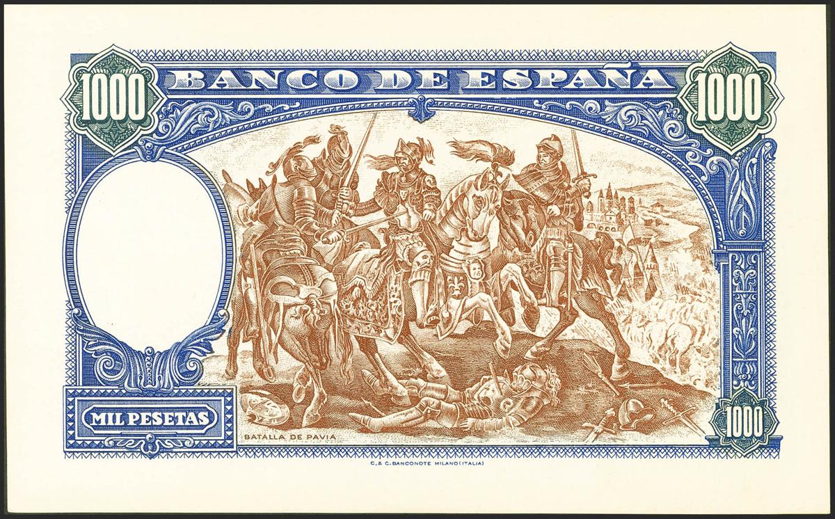 Conjunto de las pruebas de anverso y reverso de un billete no emitido de 1000 Pesetas, fechado el 18 de Julio de 1937. Sin numeración. (Edifil 2021: NE45P). Extraordinariamente raro conjunto, conserva todo su apresto original. SC.
