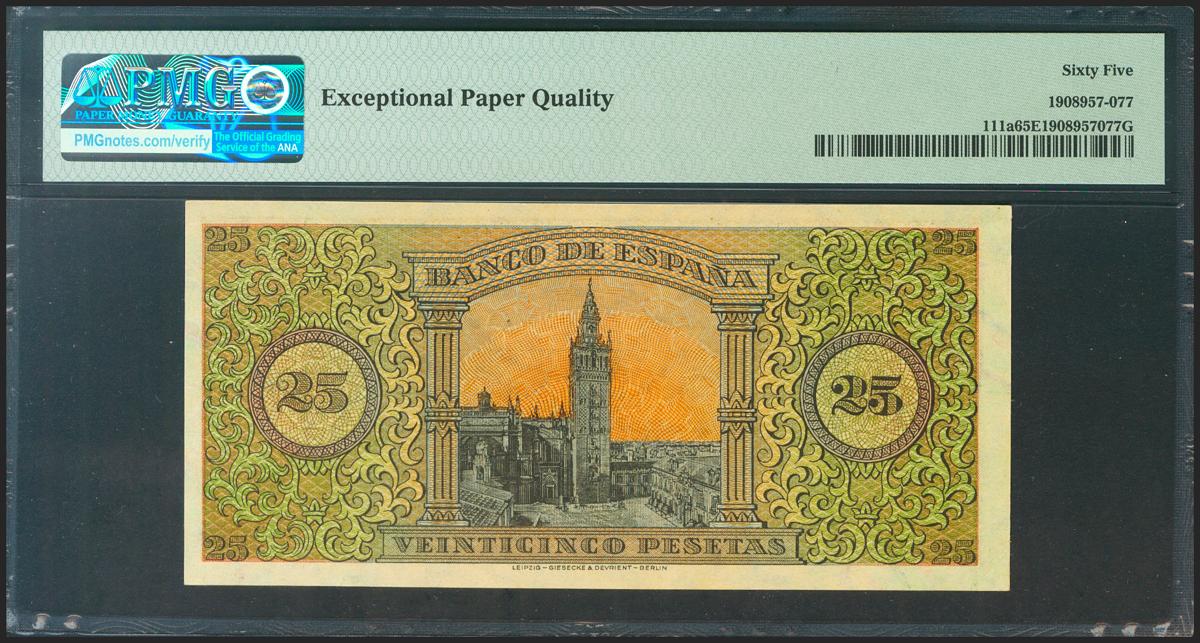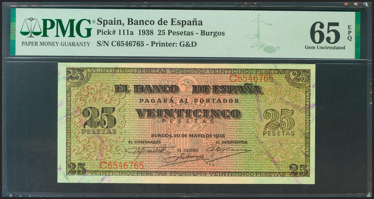 25 Pesetas. 20 de Mayo de 1938. Serie C. (Edifil 2021: 430a, Pick: 111a). Inusual en esta calidad, apresto original. SC. Encapsulado PMG65EPQ.