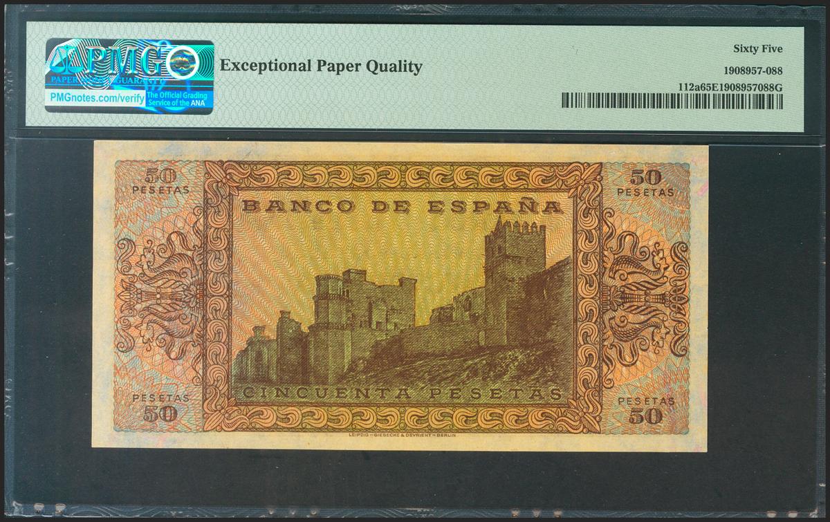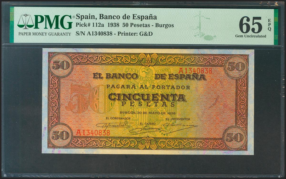 50 Pesetas. 20 de Mayo de 1938. Serie A. (Edifil 2021: 431, Pick: 112a). Raro en esta calidad, apresto original. SC. Encapsulado PMG65EPQ.