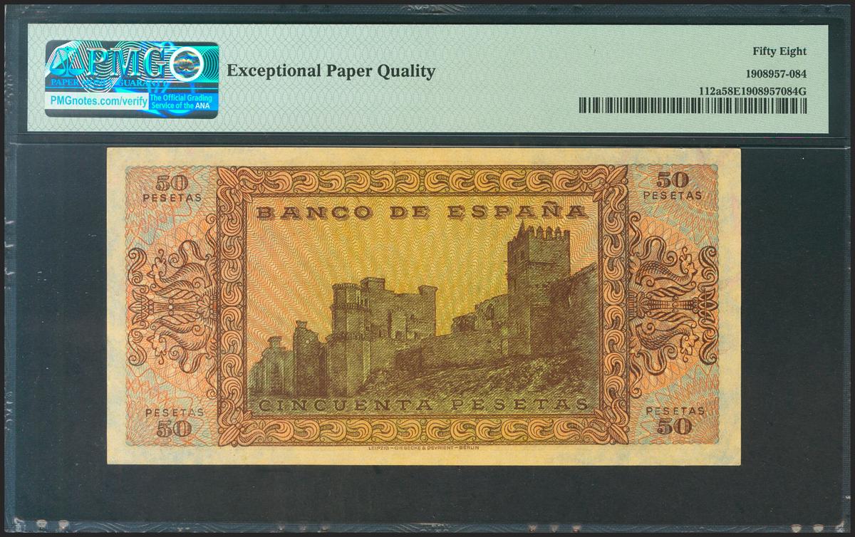 50 Pesetas. 20 de Mayo de 1938. Serie A. (Edifil 2021: 431, Pick: 112a). Apresto original. EBC+++. Encapsulado PMG58EPQ.