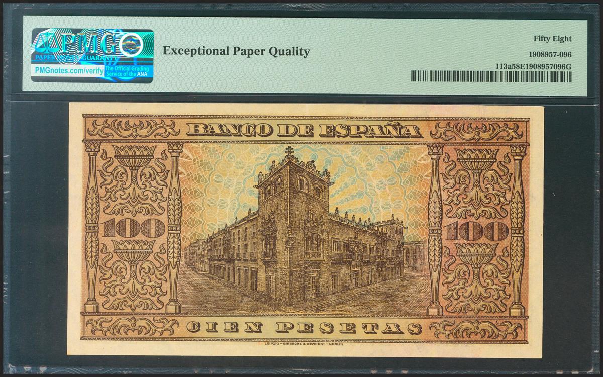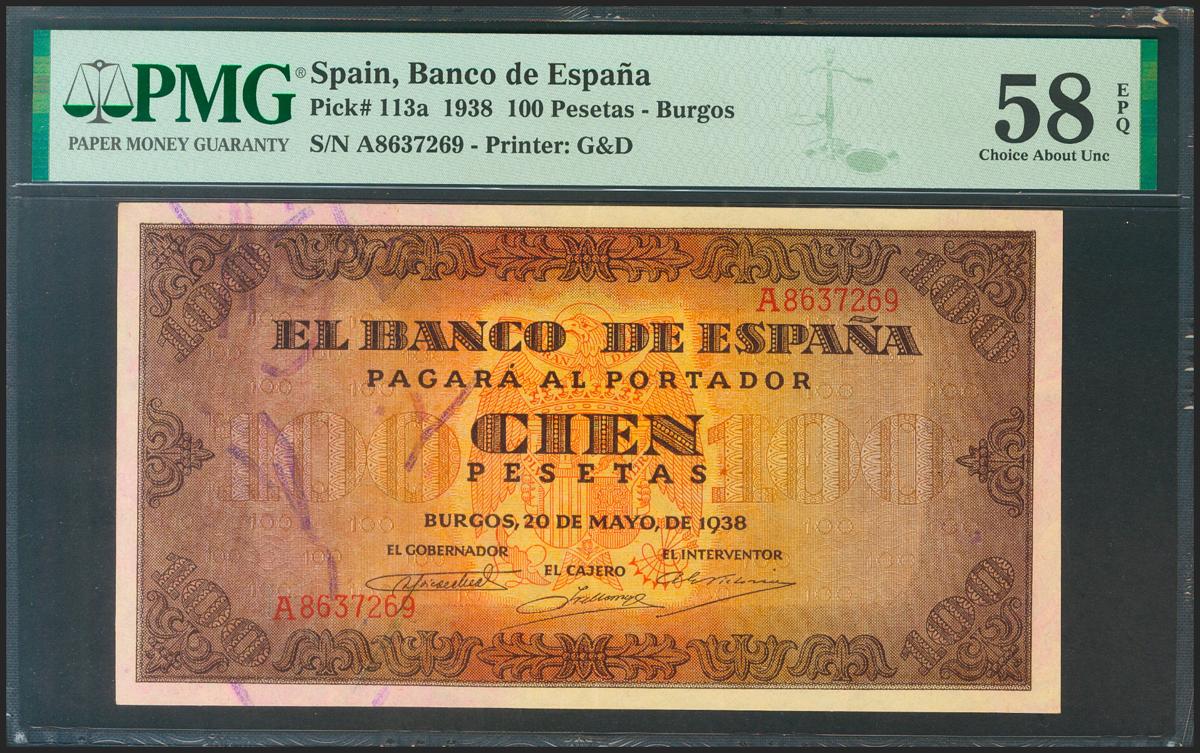 100 Pesetas. 20 de Mayo de 1938. Serie A. (Edifil 2021: 432, Pick: 113a). Apresto original. EBC+++. Encapsulado PMG58EPQ.