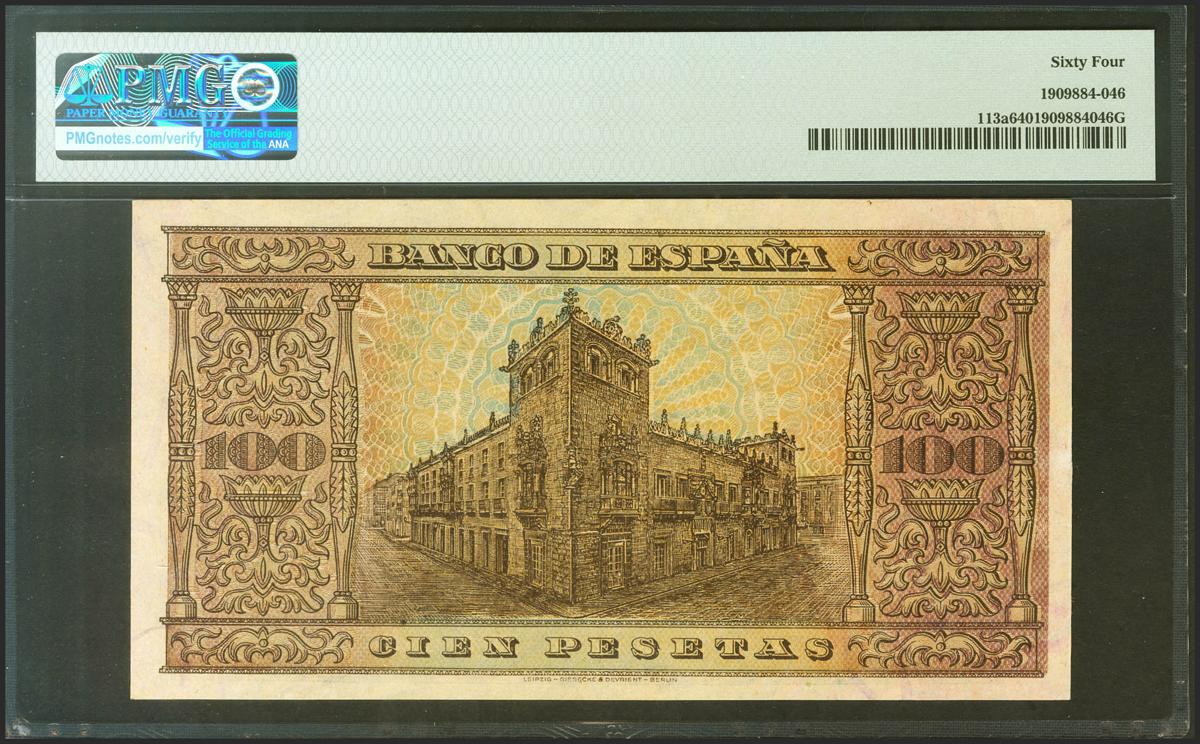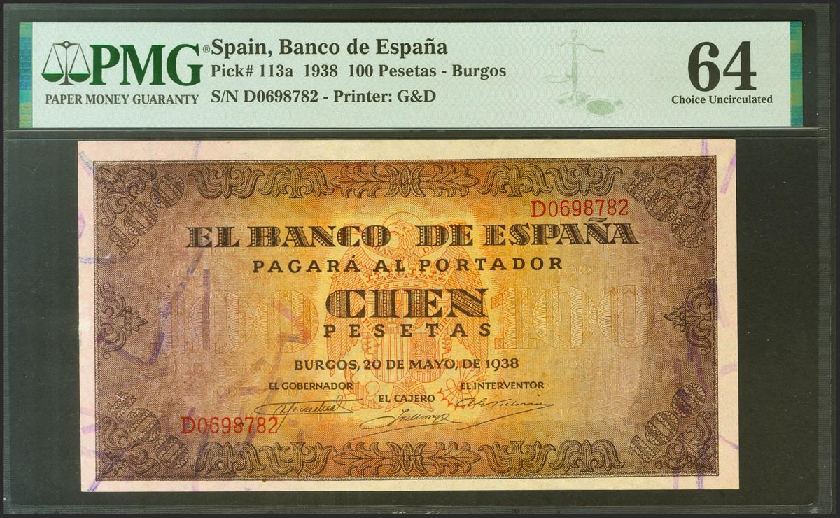 100 Pesetas. 20 de Mayo de 1938. Serie D. (Edifil 2021: 432a, Pick: 113a). Raro. SC. Encapsulado PMG64.