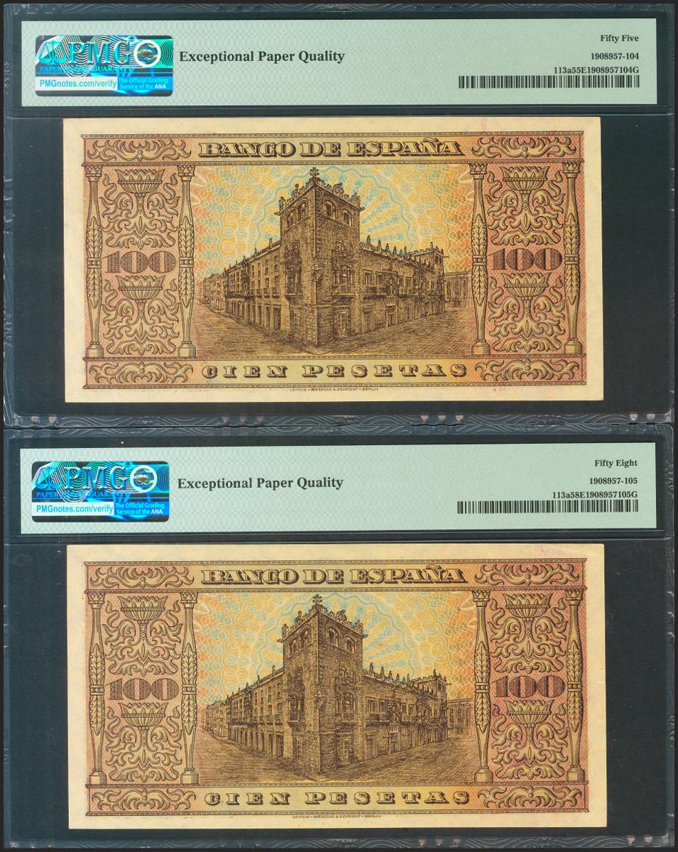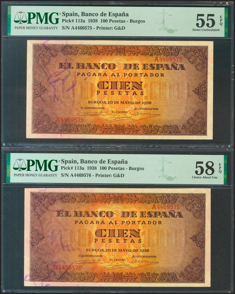 100 Pesetas. 20 de Mayo de 1938. Pareja correlativa. Serie A. (Edifil 2021: 432, Pick: 113a). Apresto original. EBC+. Encapsulado PMG58EPQ/55EPQ.