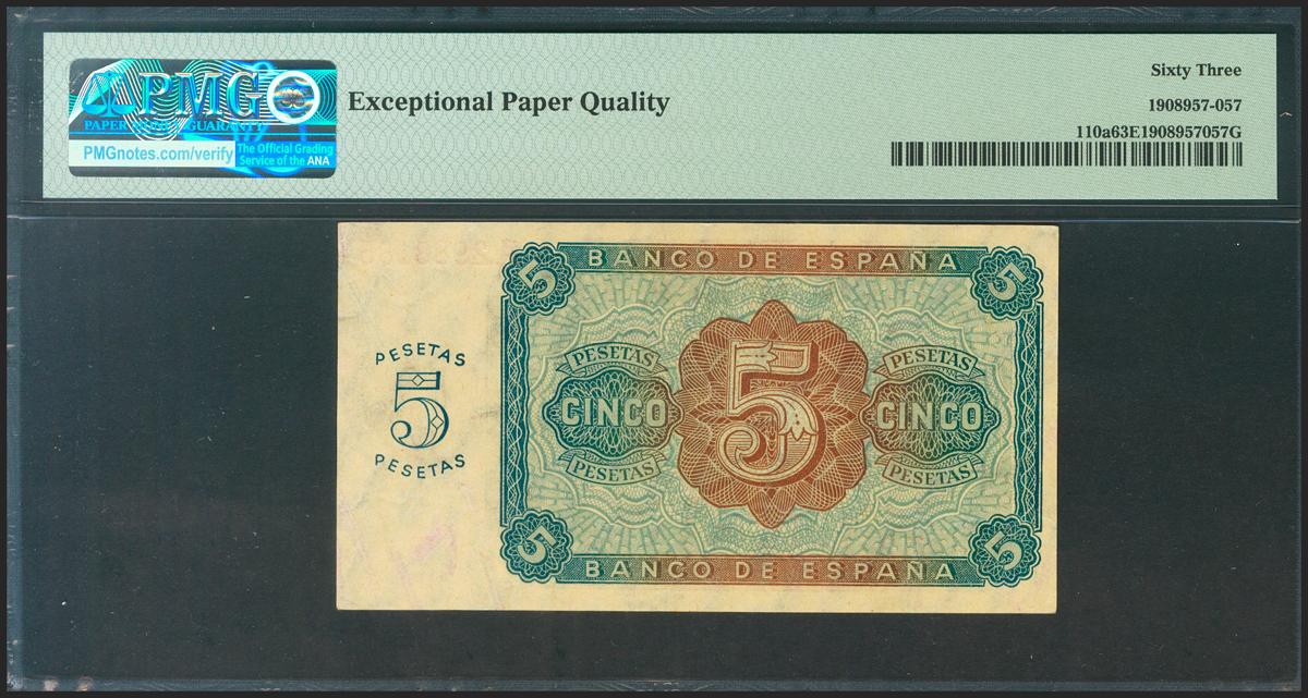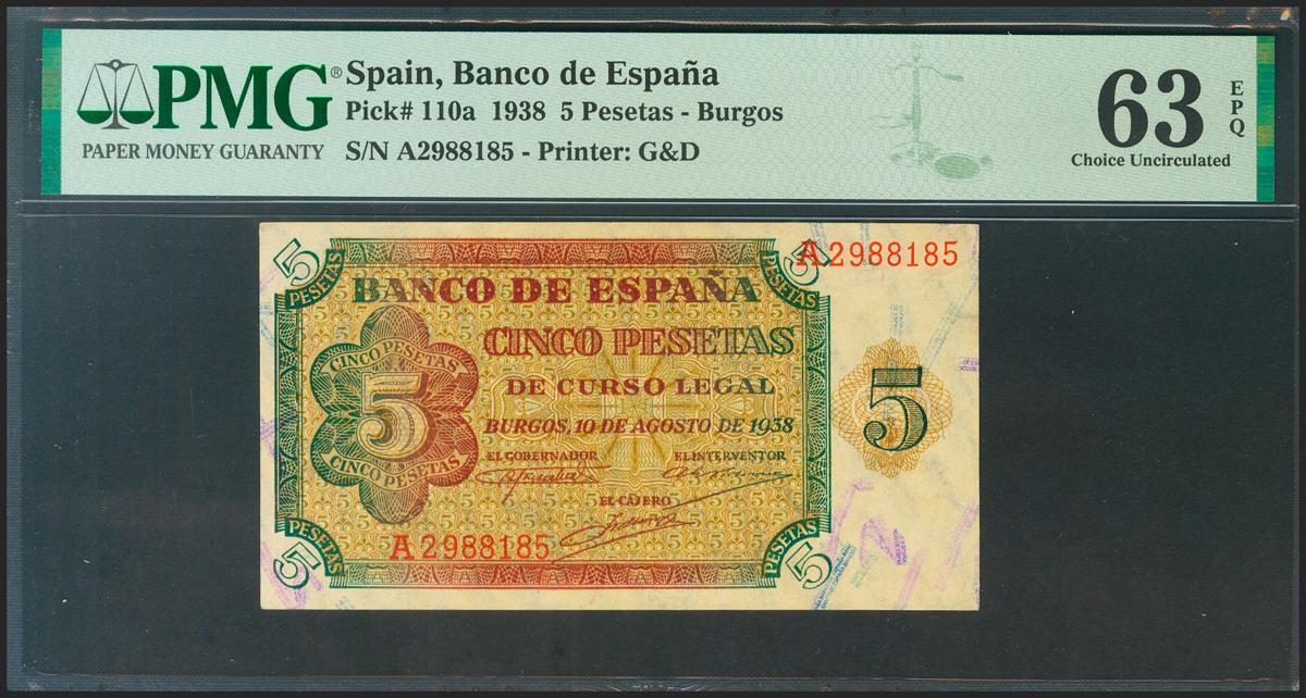 5 Pesetas. 10 de Agosto de 1938. Serie A. (Edifil 2021: 435, Pick: 110a). Inusual en esta calidad, apresto original. SC. Encapsulado PMG63EPQ.