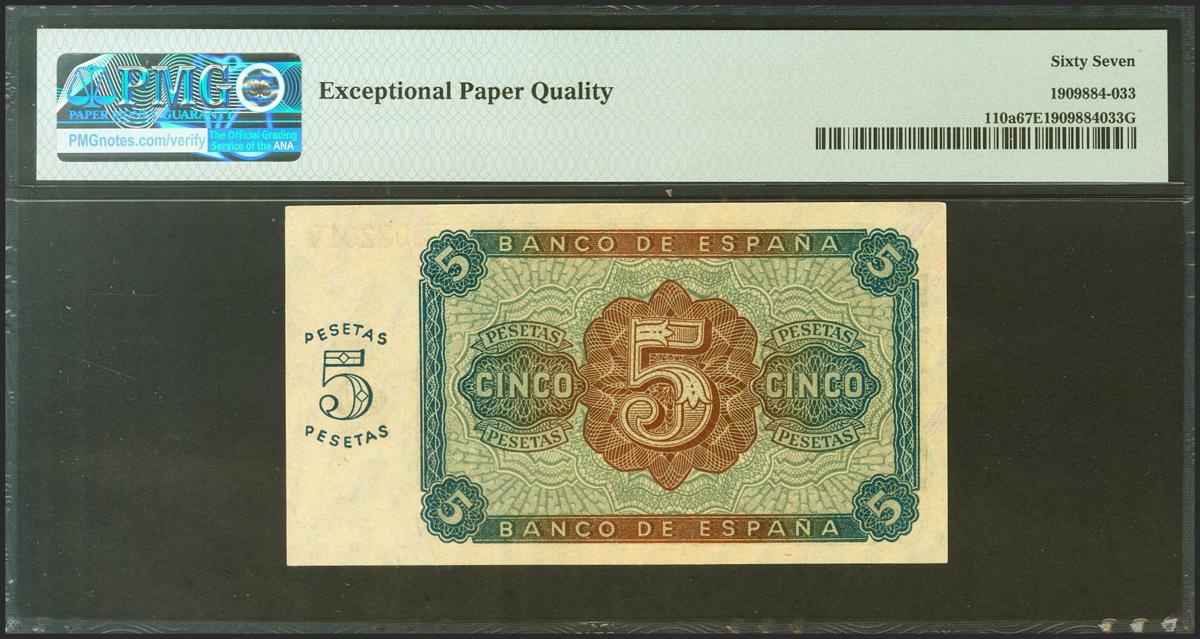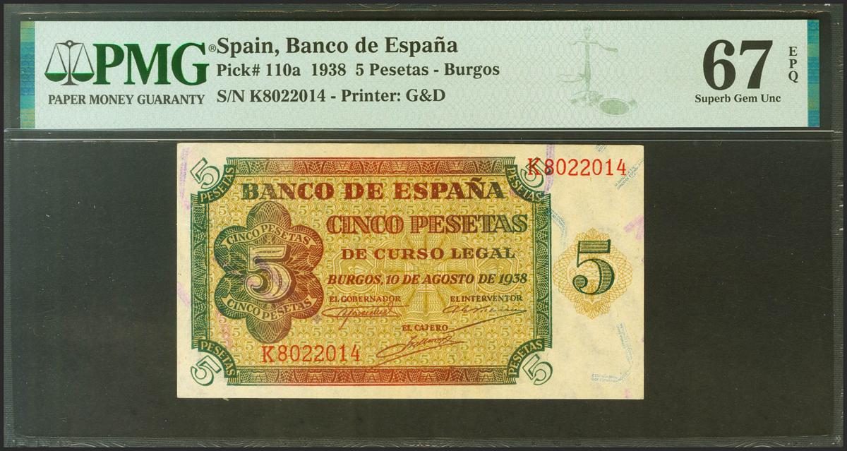 5 Pesetas. 10 de Agosto de 1938. Serie K. (Edifil 2021: 435a, Pick: 110a). Raro en esta excepcional calidad, apresto original. SC. Encapsulado PMG67EPQ.