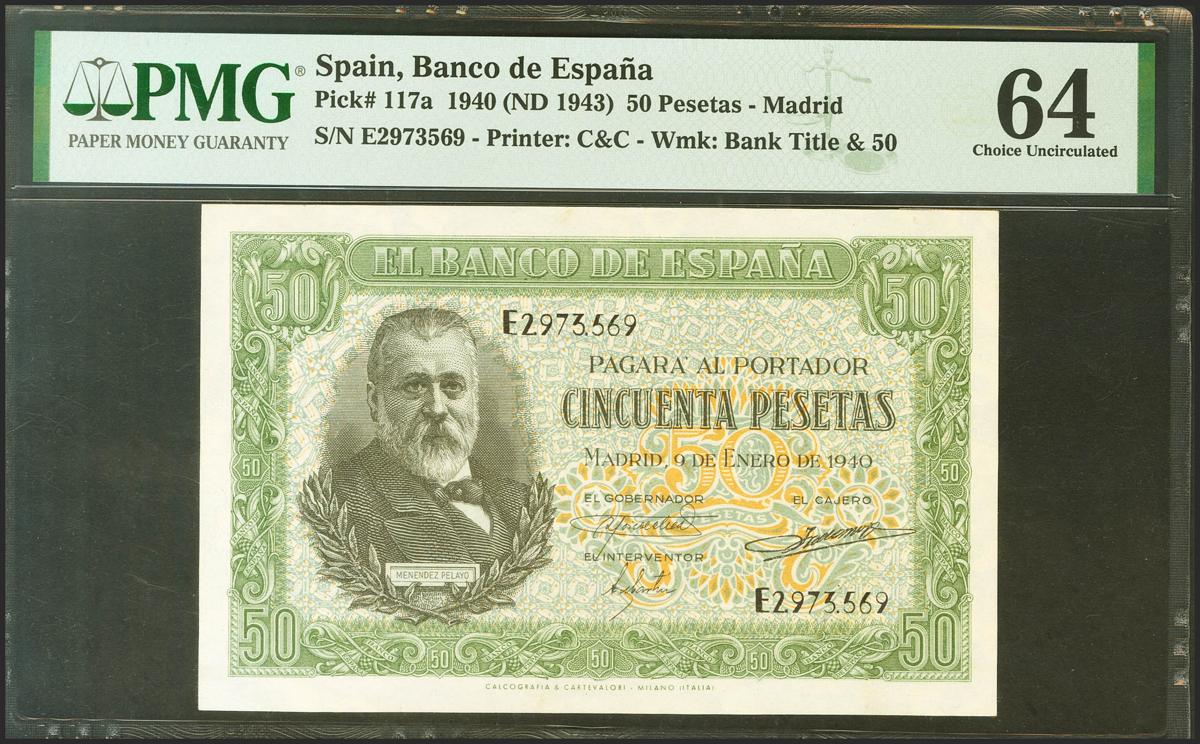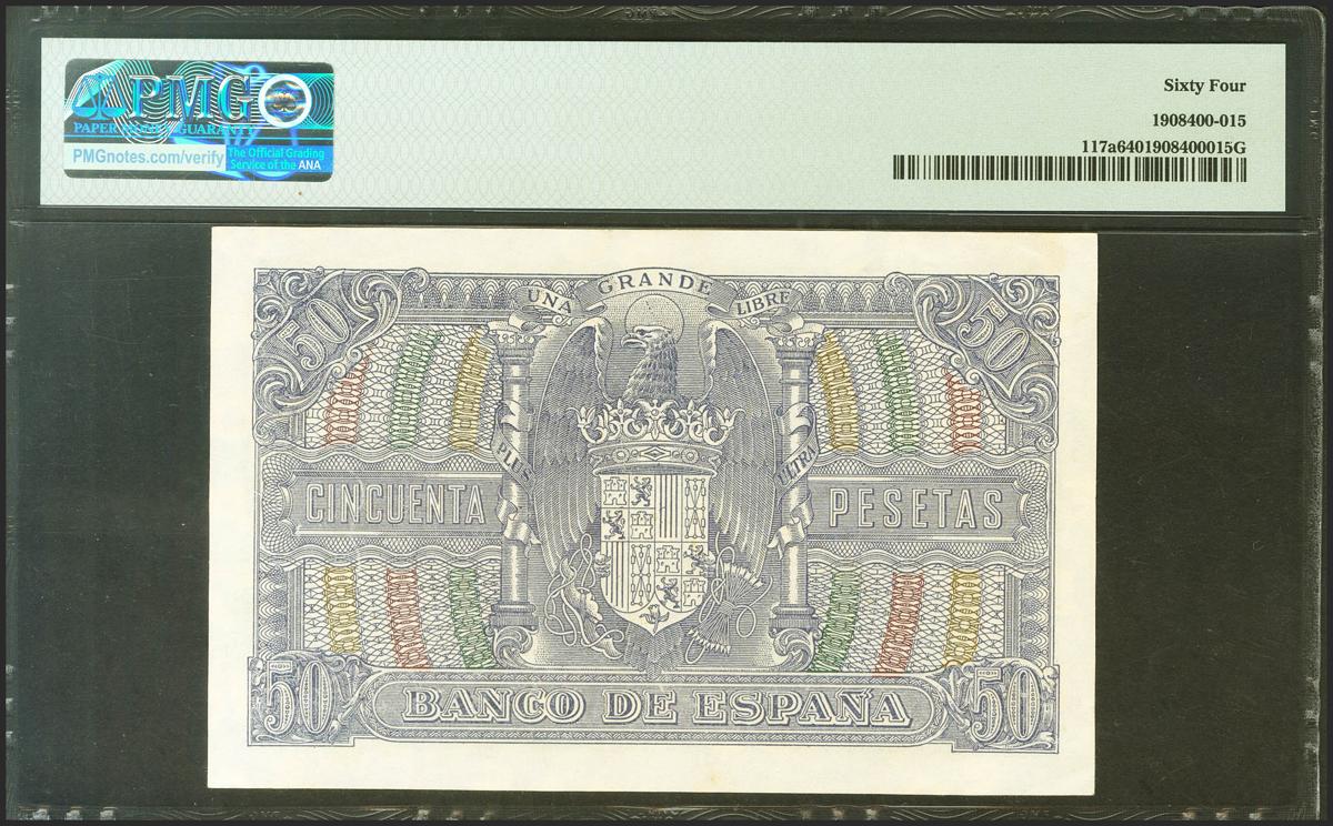 50 Pesetas. 9 de Enero de 1940. Serie E, última serie emitida. (Edifil 2021: 437a, Pick: 117a). SC. Encapsulado PMG64.