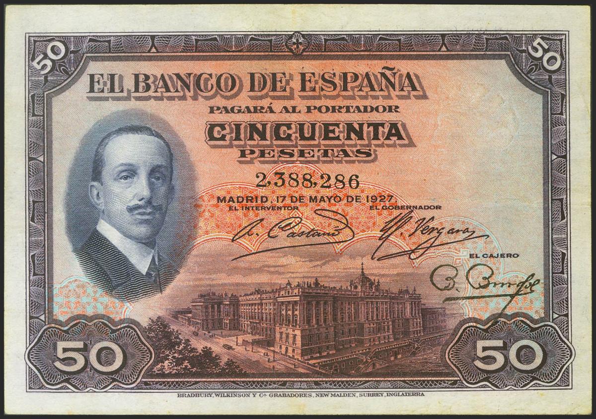 50 Pesetas. 17 de Mayo de 1927. Sin serie. (Edifil 2021: 326). MBC.