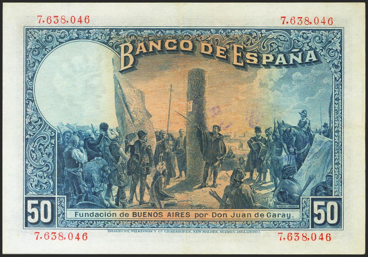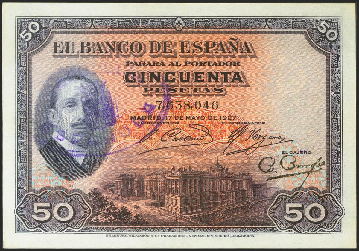 50 Pesetas. 17 de Mayo de 1927. Sin serie y sello de caucho de REPUBLICA ESPAÑOLA. (Edifil 2021: 332). MBC+.