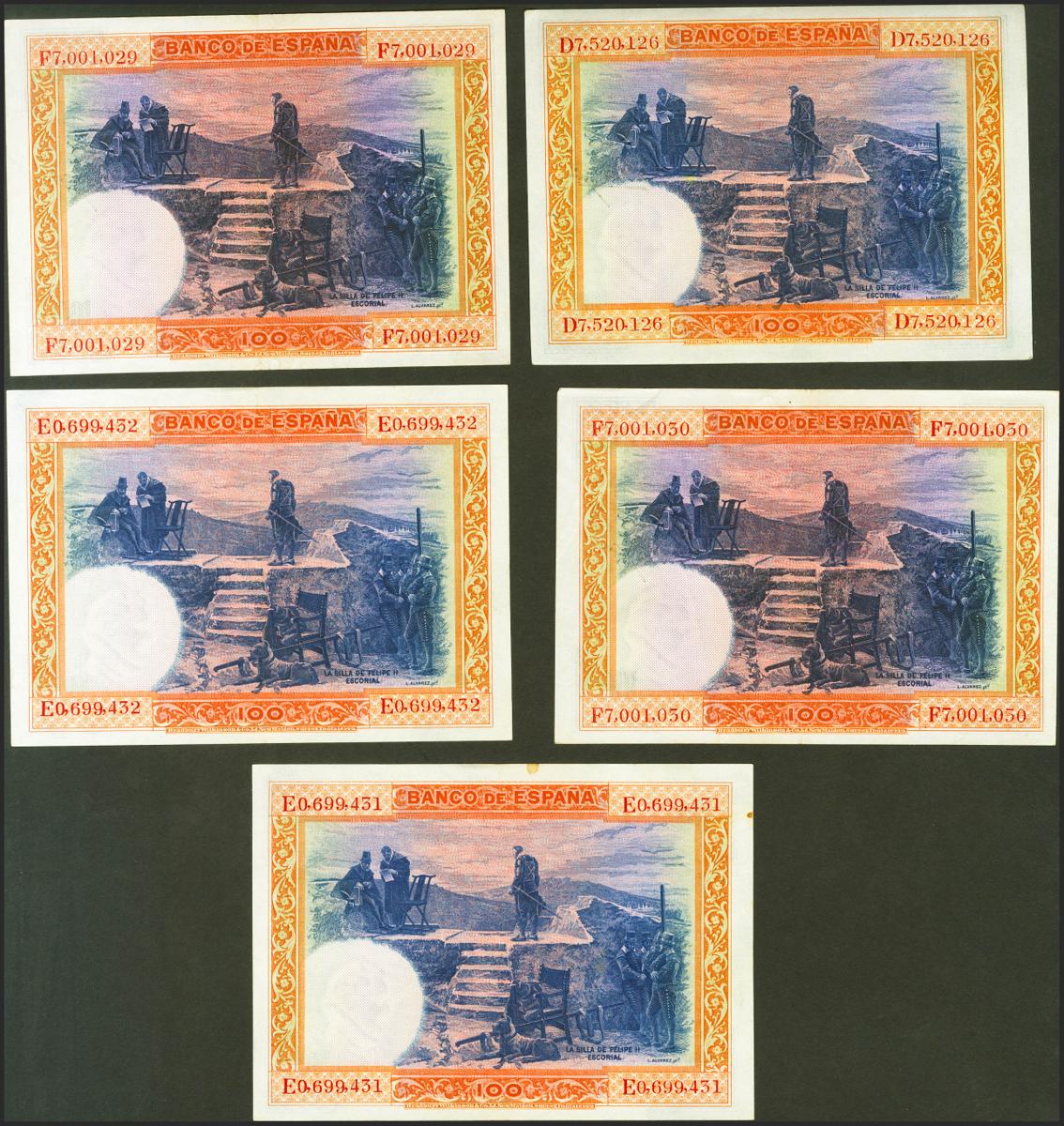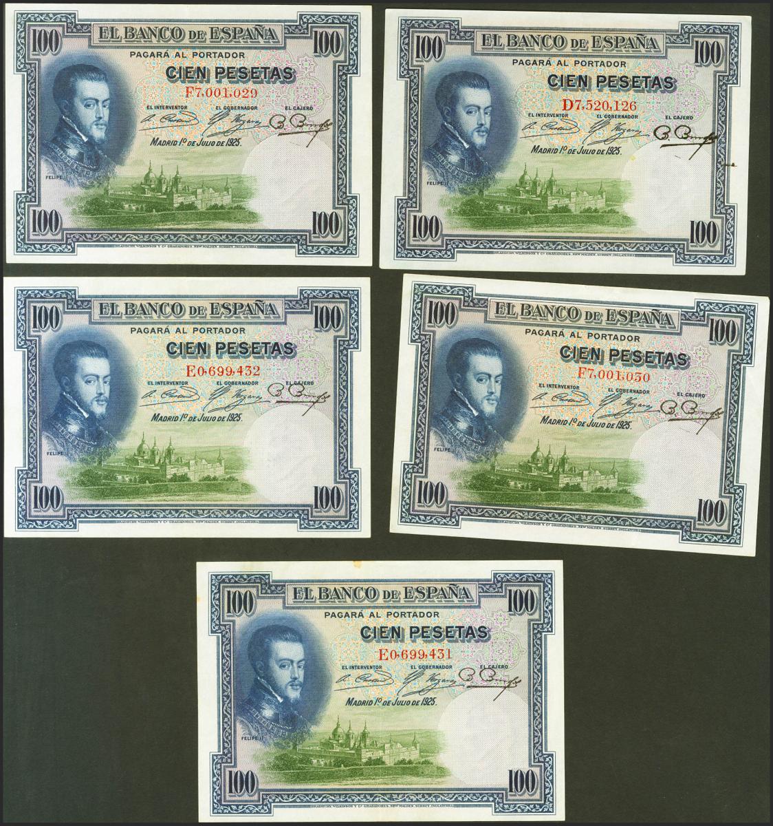 Conjunto de 5 billetes de 100 Pesetas emitidos el 1 de Julio de 1925, con las series D, E y F (estas dos últimas parejas correlativas). (Edifil 2021: 350). La mayoría conservan el apresto original. EBC/EBC+.