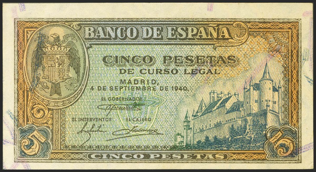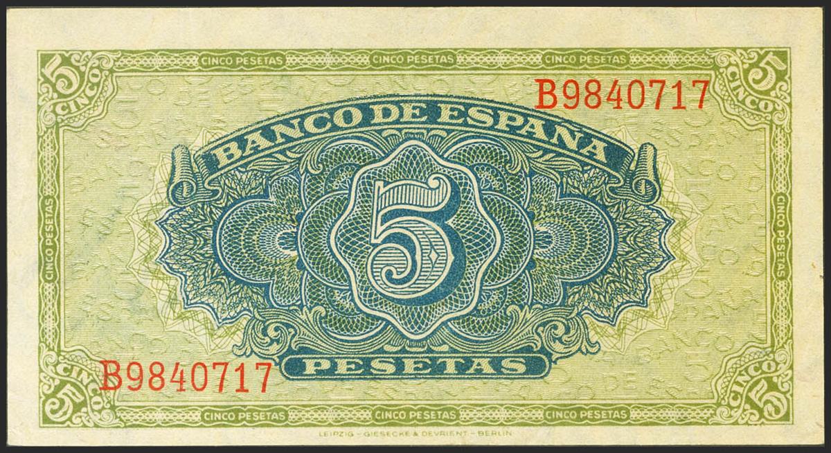 5 Pesetas. 4 de Septiembre de 1940. Serie B. (Edifil 2021: 443a). Conserva todo su apresto original. SC-.