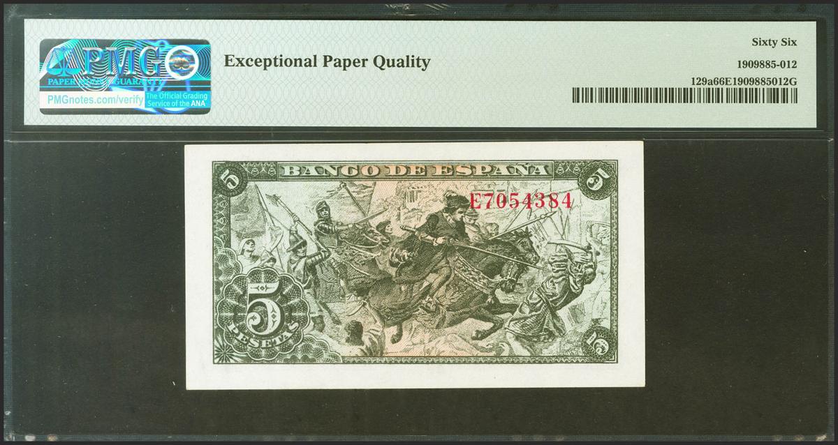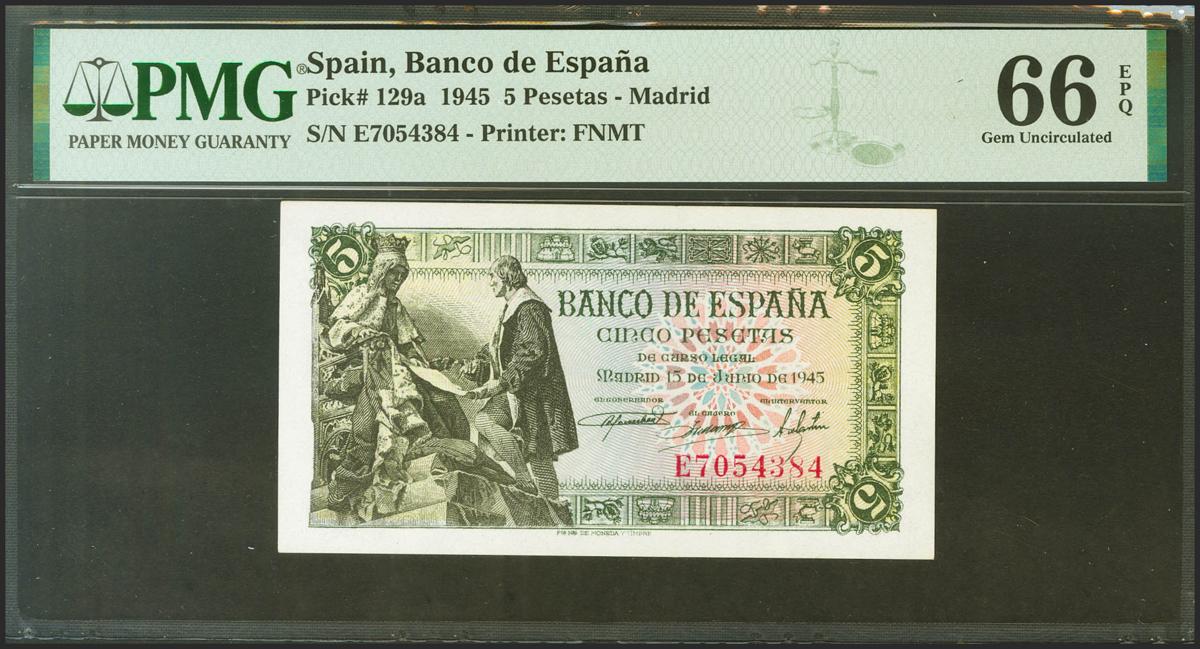 5 Pesetas. 15 de Junio de 1945. Serie E. (Edifil 2021: 449, Pick: 129a). Raro en esta excepcional calidad, apresto original. SC. Encapsulado PMG66EPQ.