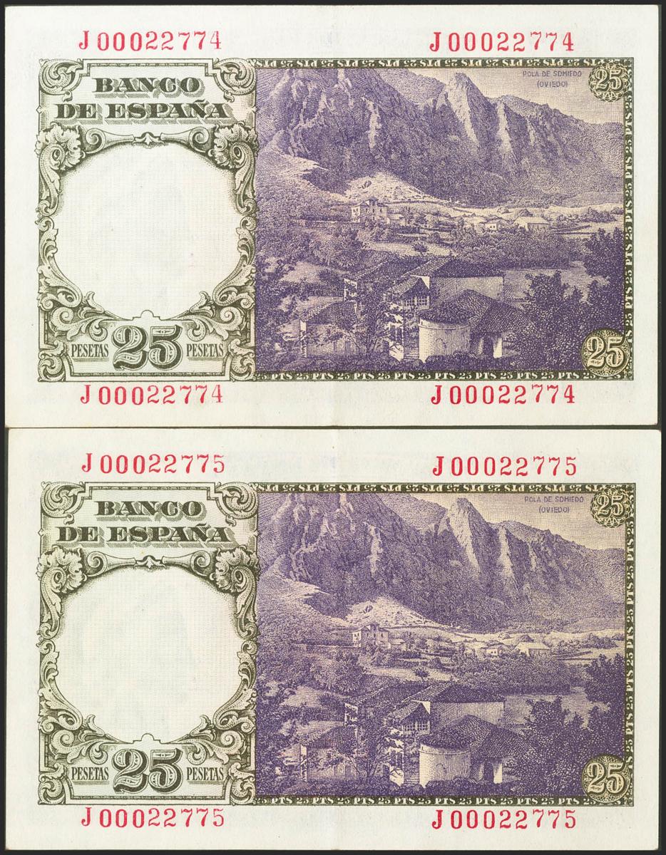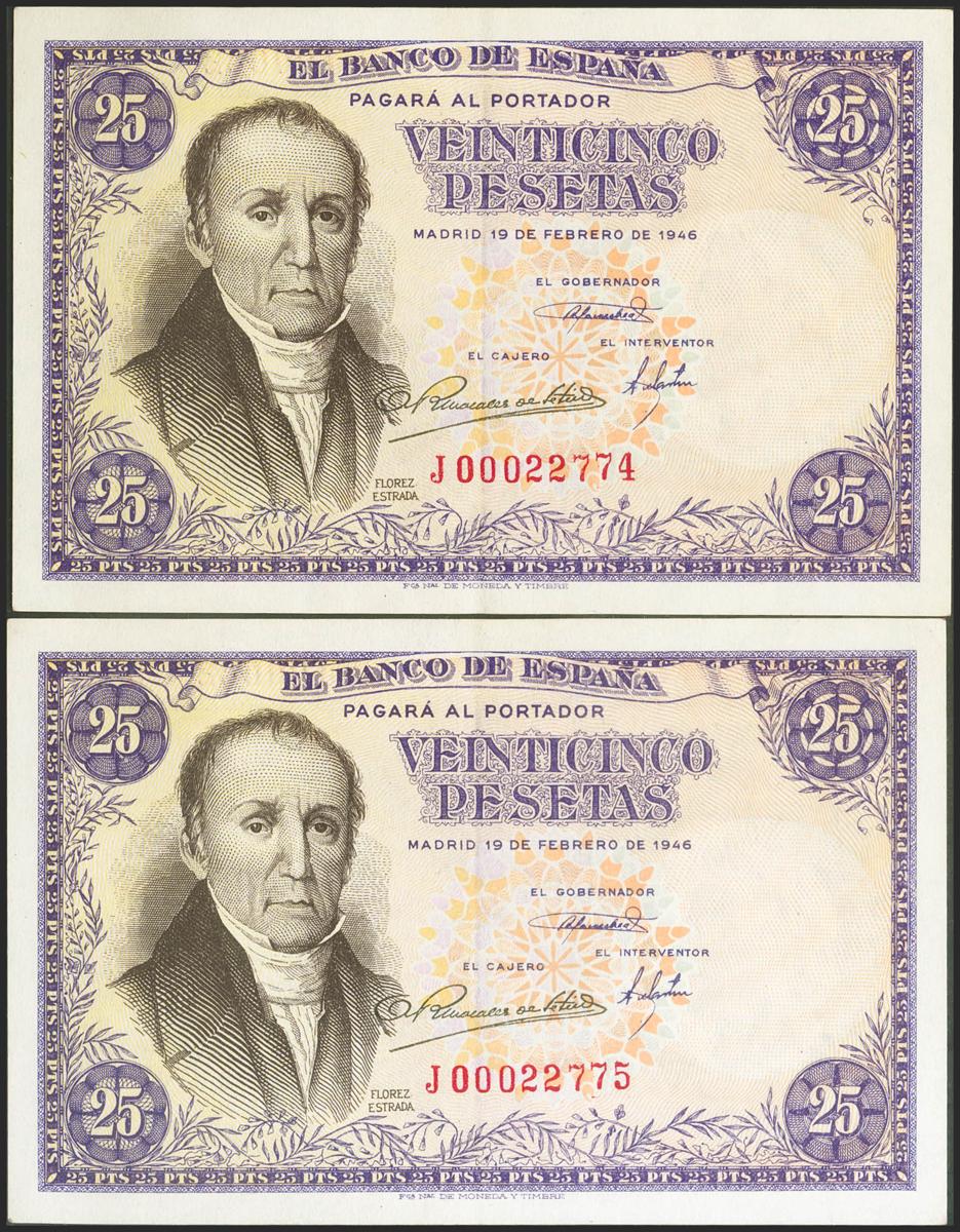 25 Pesetas. 19 de Febrero de 1946. Pareja correlativa. Serie U. (Edifil 2021: 450a). Conserva la mayor parte del apresto original. EBC+.
