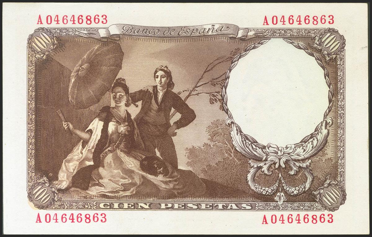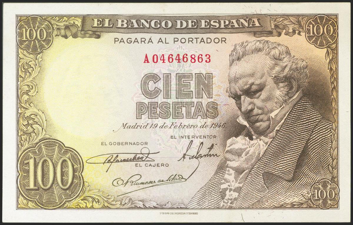 100 Pesetas. 19 de Febrero de 1946. Serie A. (Edifil 2021: 451a). Conserva parte del apresto original. EBC+.