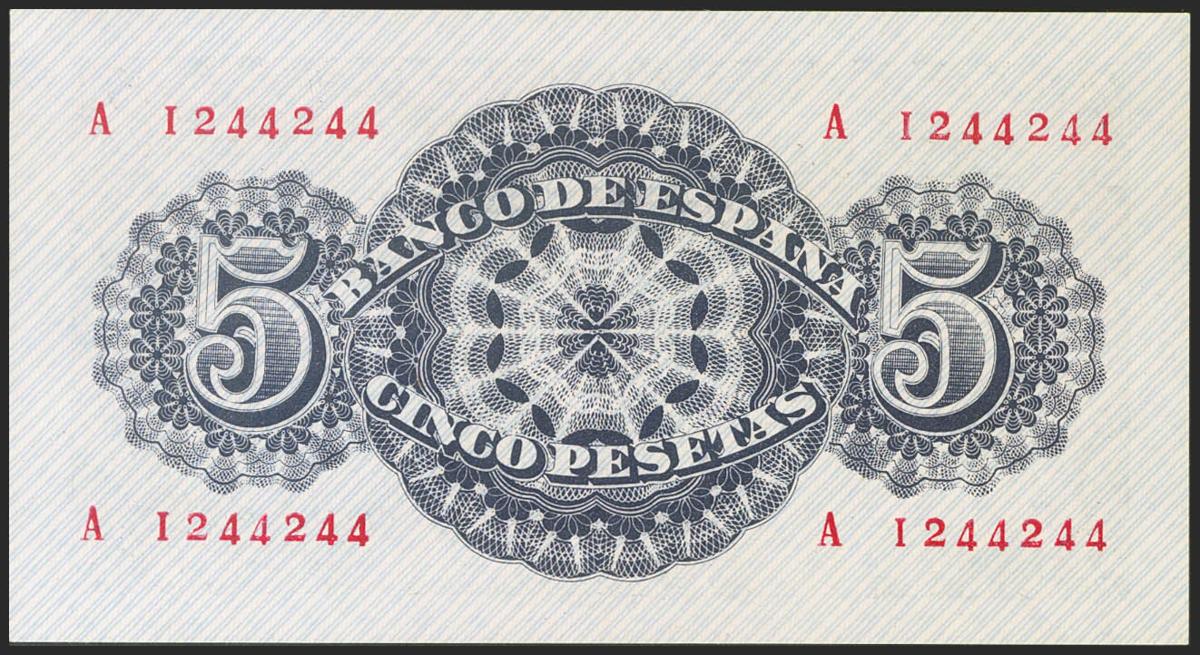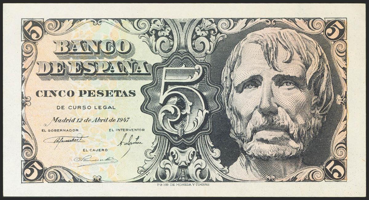 5 Pesetas. 12 de Abril de 1947. Serie A. (Edifil 2017: 454a). Conserva todo su apresto original. SC-.