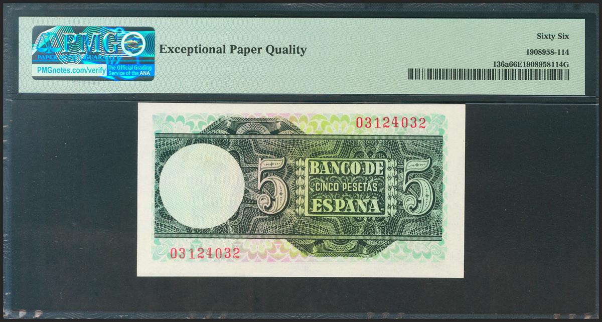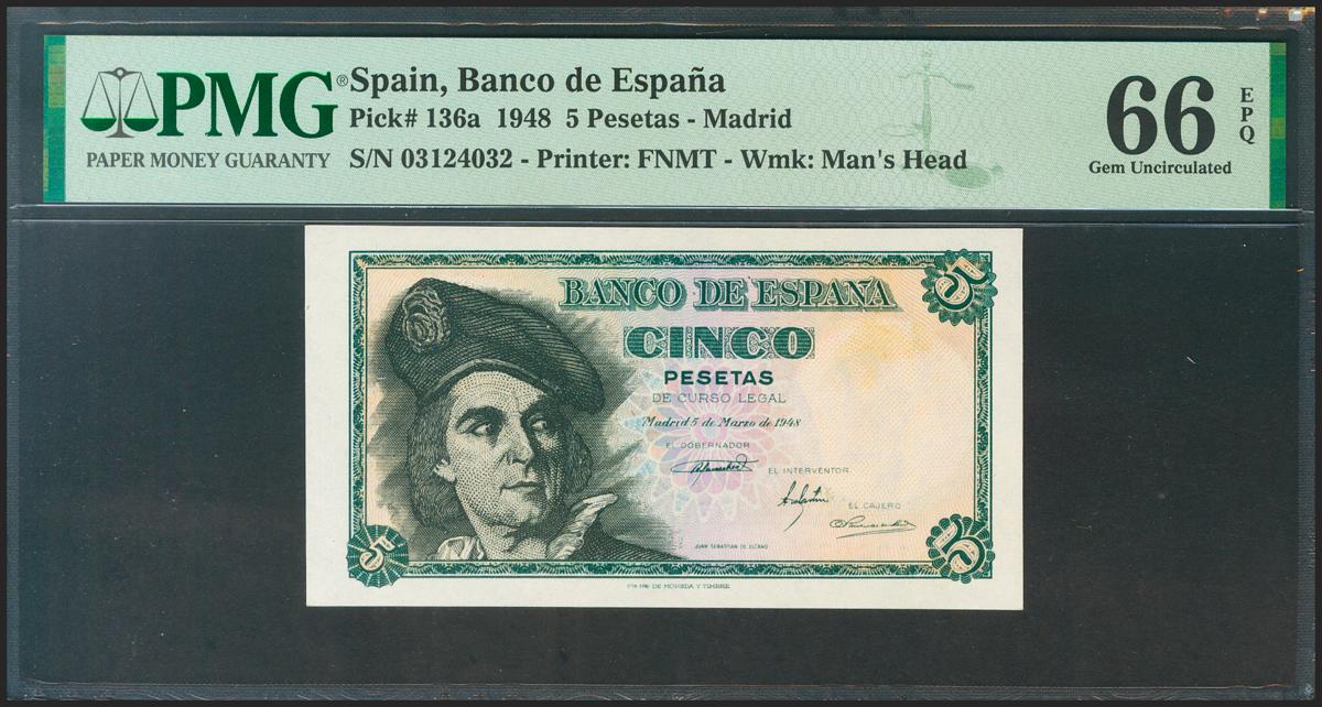 5 Pesetas. 15 de Marzo de 1948. Sin serie. (Edifil 2021: 455, Pick: 136a). Raro en esta calidad, apresto roiginal. SC. Encapsulado PMG66EPQ.