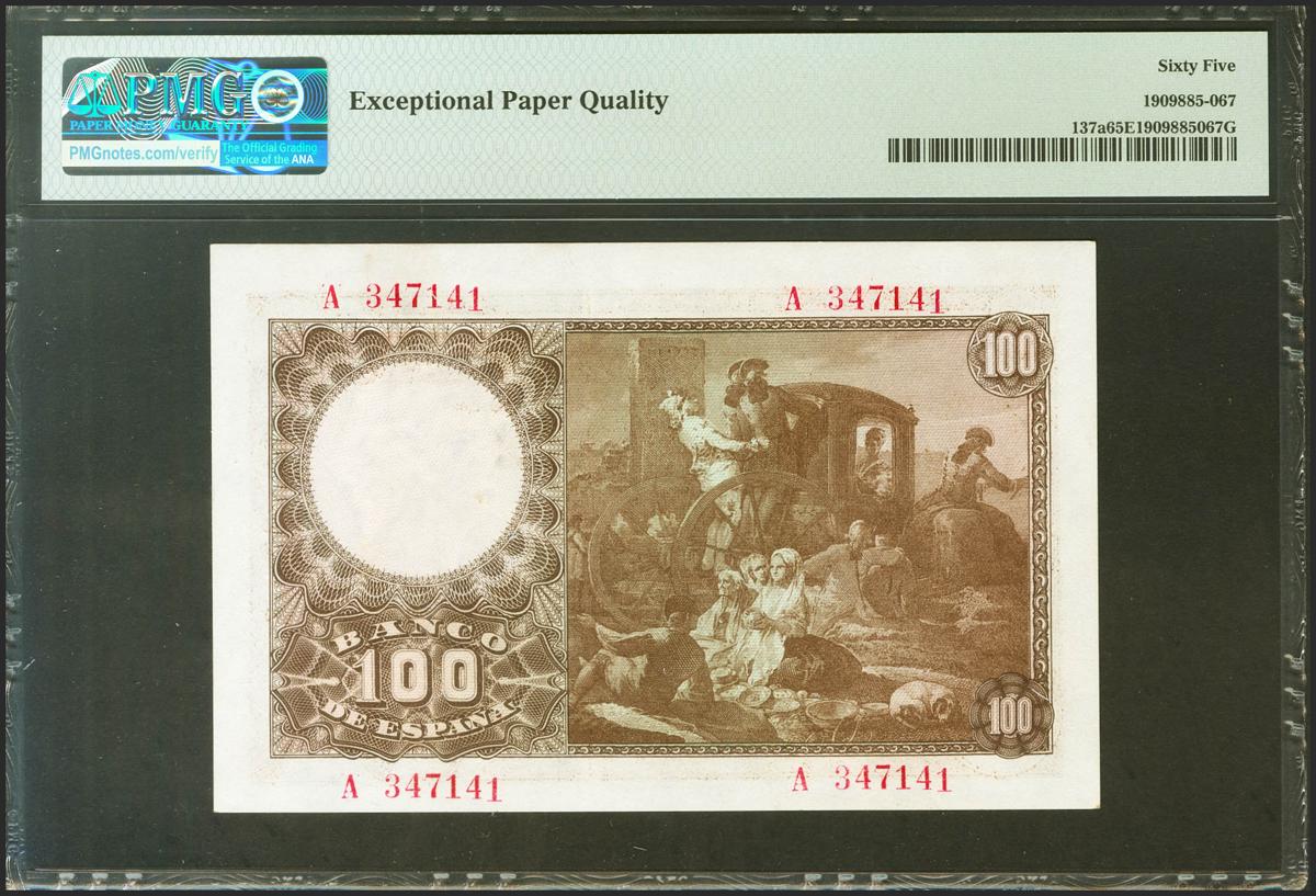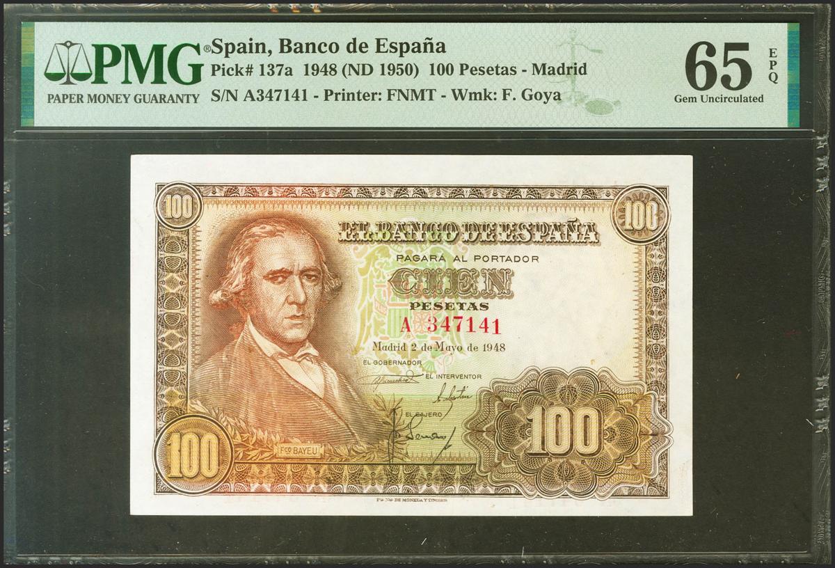 100 Pesetas. 2 de Mayo de 1948. Serie A. (Edifil 2021: 456a, Pick: 137a). Raro en esta calidad, apresto original. SC. Encapsulado PMG65EPQ.