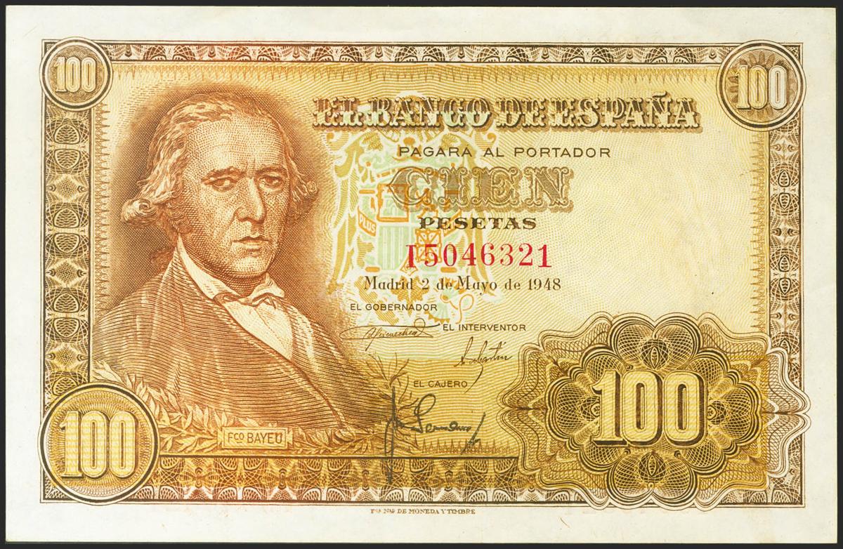 100 Pesetas. 2 de Mayo de 1948. Serie I. (Edifil 2021: 456a). Conserva gran parte del apresto original. SC--.