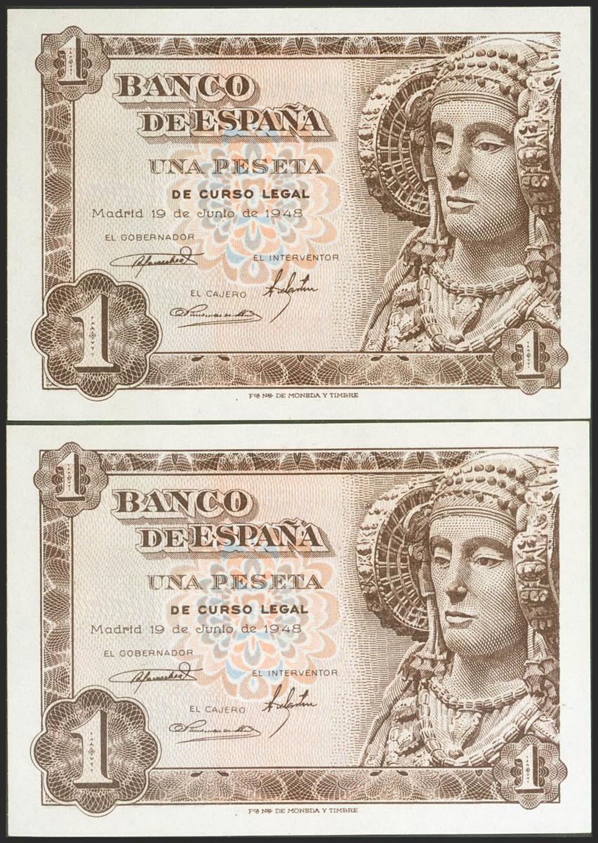 1 Peseta. 19 de Junio de 1948. Pareja correlativa. Serie M. (Edifil 2021: 457a). Apresto original. SC.