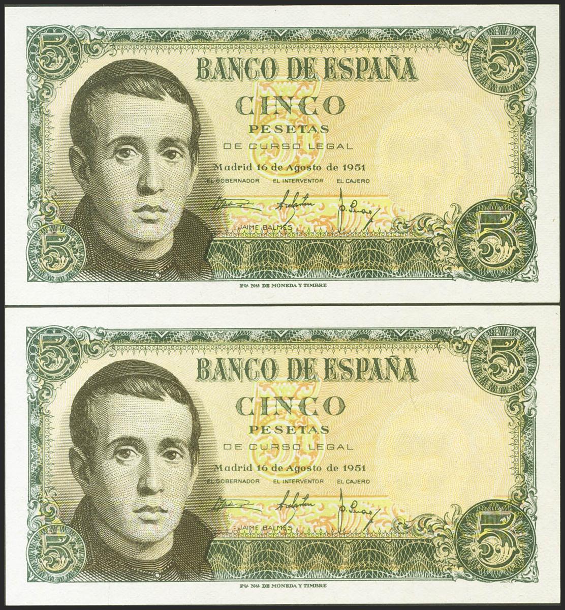 5 Pesetas. 16 de Agosto de 1951. Pareja correlativa. Serie C. (Edifil 2021: 459a). Apresto original. SC.