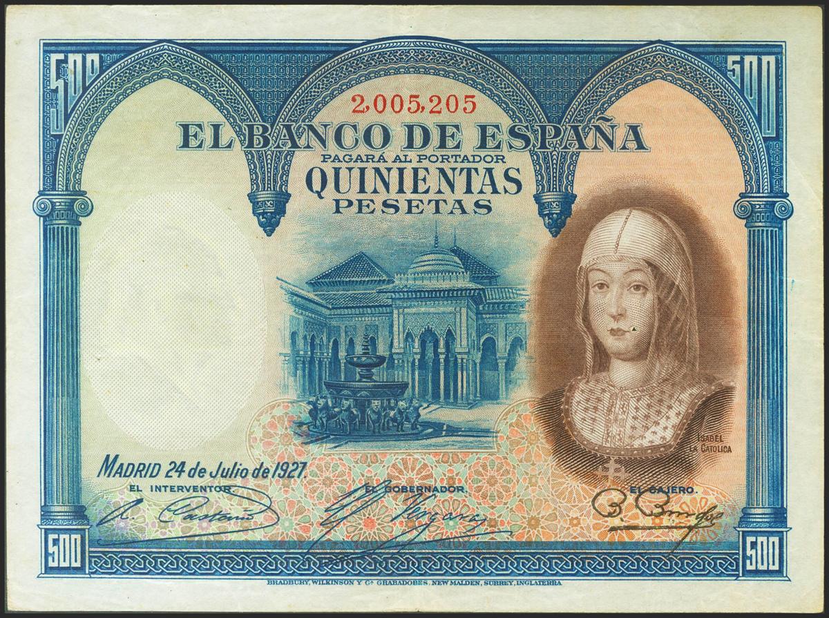 500 Pesetas. 24 de Julio de 1927. Sin serie. (Edifil 2017: 352). MBC-.