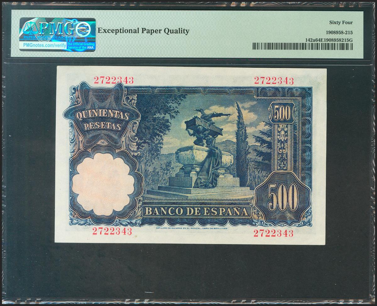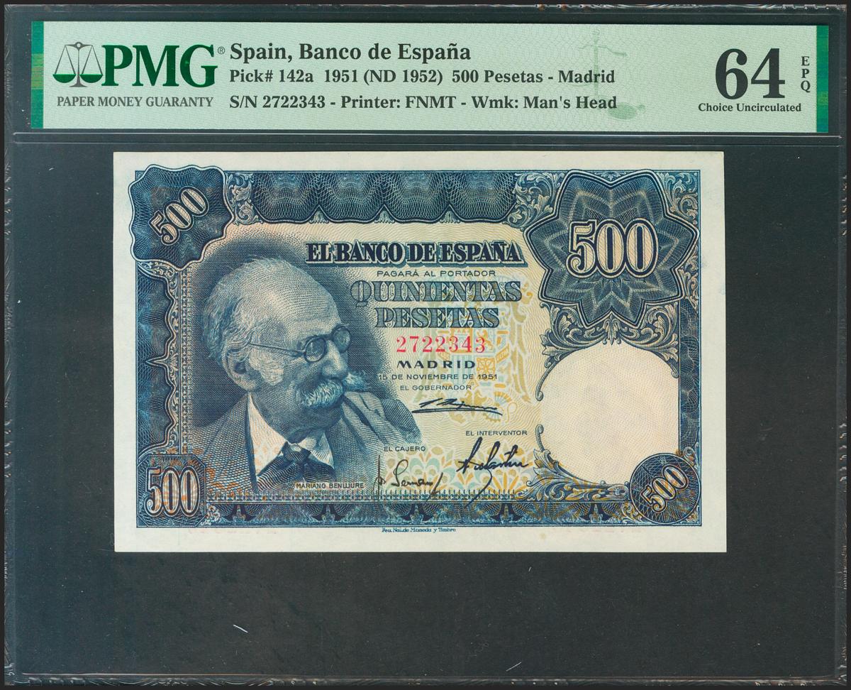 500 Pesetas. 15 de Noviembre de 1951. Sin serie. (Edifil 2021: 460, Pick: 142a). Raro en esta calidad, apresto original. SC. Encapsulado PMG64EPQ.