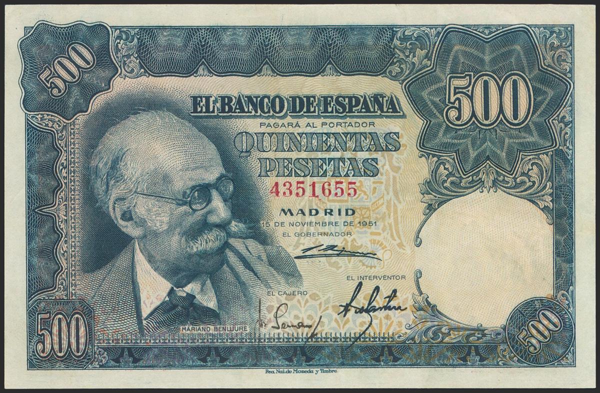 500 Pesetas. 15 de Noviembre de 1951. Sin serie. (Edifil 2021: 460). Conserva gran parte del apresto original. EBC+.