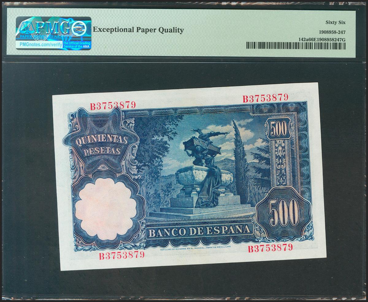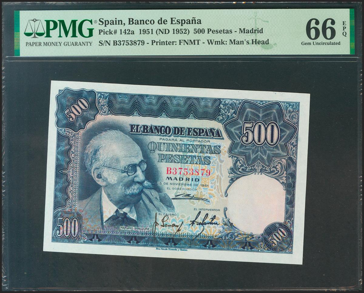 500 Pesetas. 15 de Noviembre de 1951. Serie B. (Edifil 2021: 460a, Pick: 142a). Rarísimo en esta calidad, conserva todo su apresto original. SC. Encapsulado PMG66EPQ.