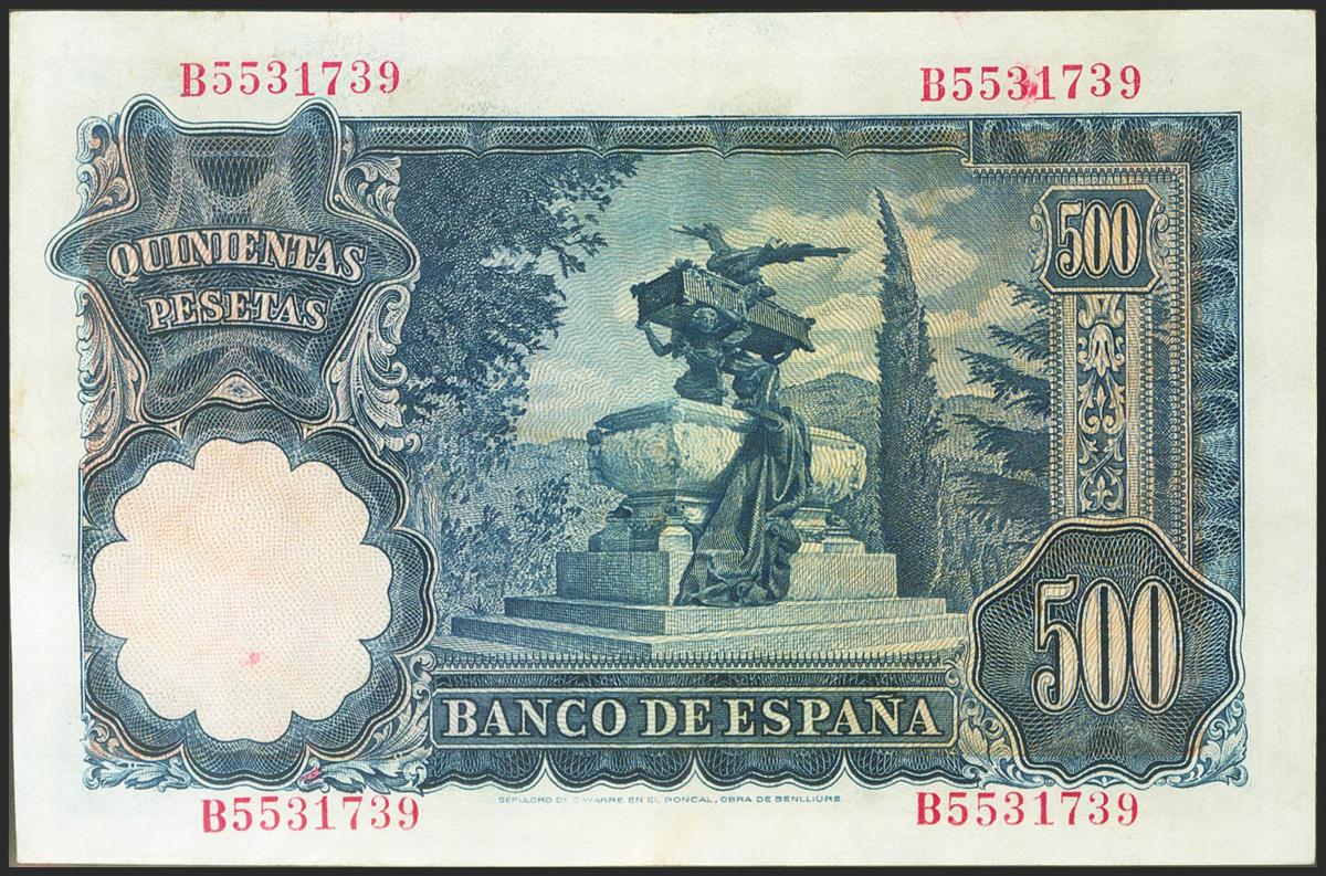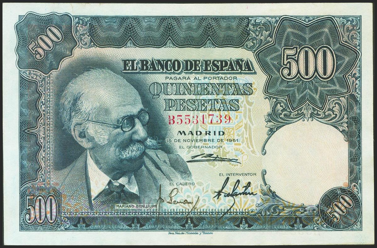 500 Pesetas. 15 de Noviembre de 1951. Serie B. (Edifil 2021: 460a). Presenta parte del apresto original. EBC-.