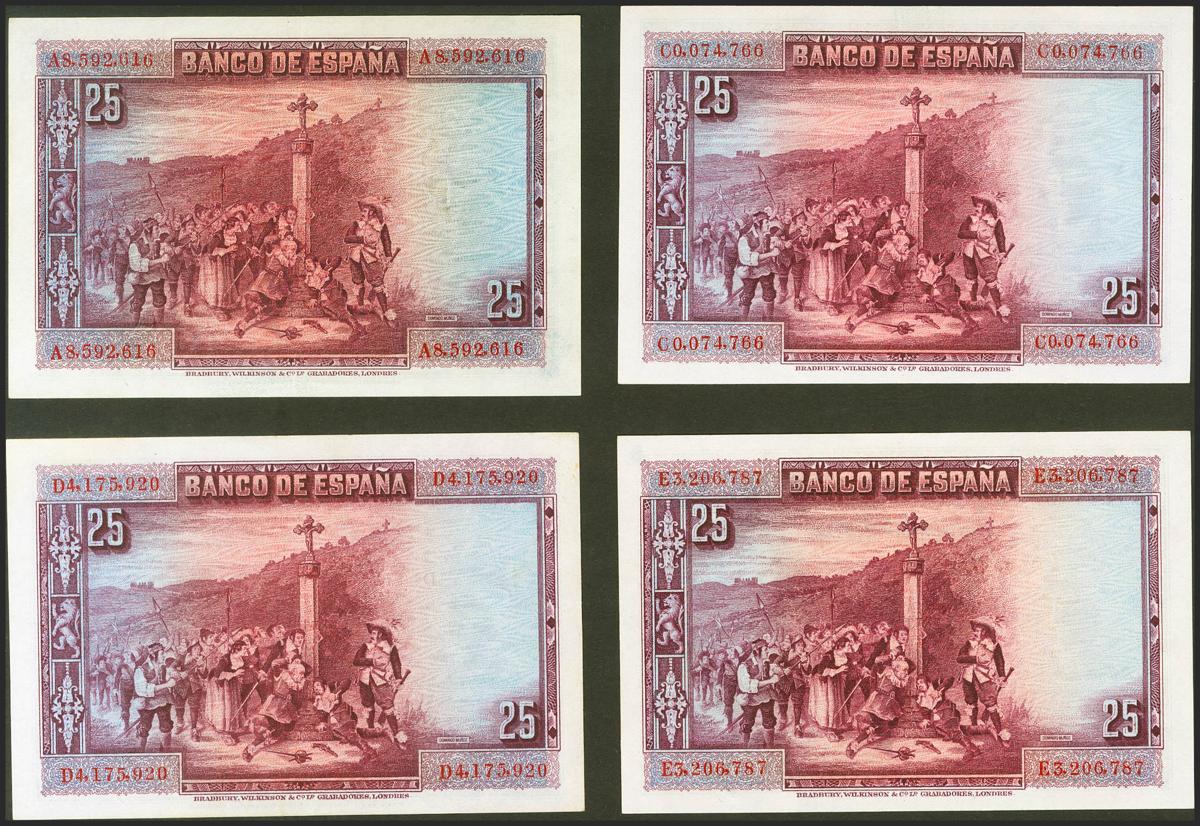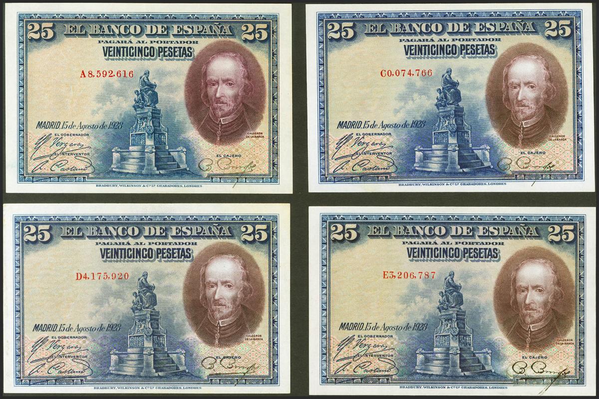 Conjunto de 4 billetes de 25 Pesetas emitidos el 15 de Agosto de 1928, con las series A, C, D y E (Edifil 2021: 353), conservan gran parte del apresto original. EBC/SC.