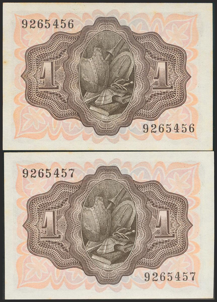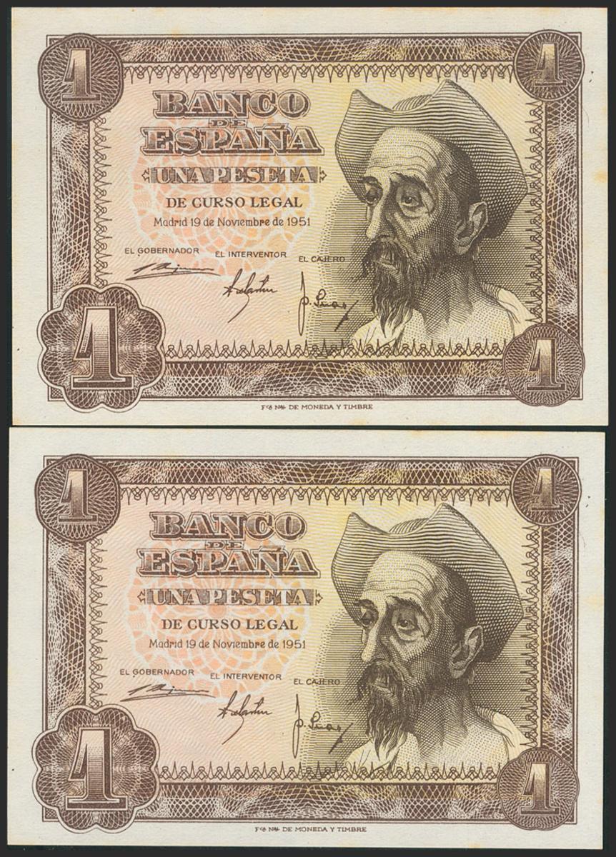 1 Peseta. 19 de Noviembre de 1951. Pareja correlativa. Sin serie. (Edifil 2021: 461). Manchitas del tiempo y apresto original. SC-.