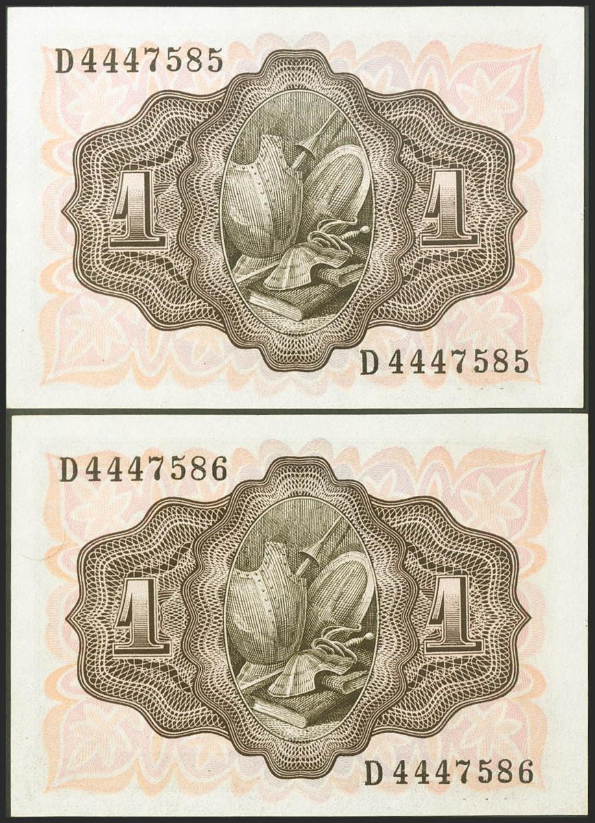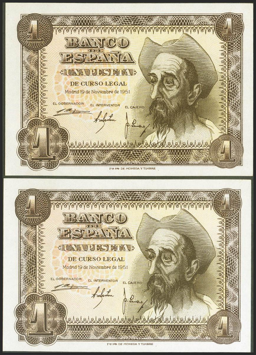 1 Peseta. 19 de Noviembre de 1951. Pareja correlativa. Serie D. (Edifil 2021: 461a). Apresto original. SC.