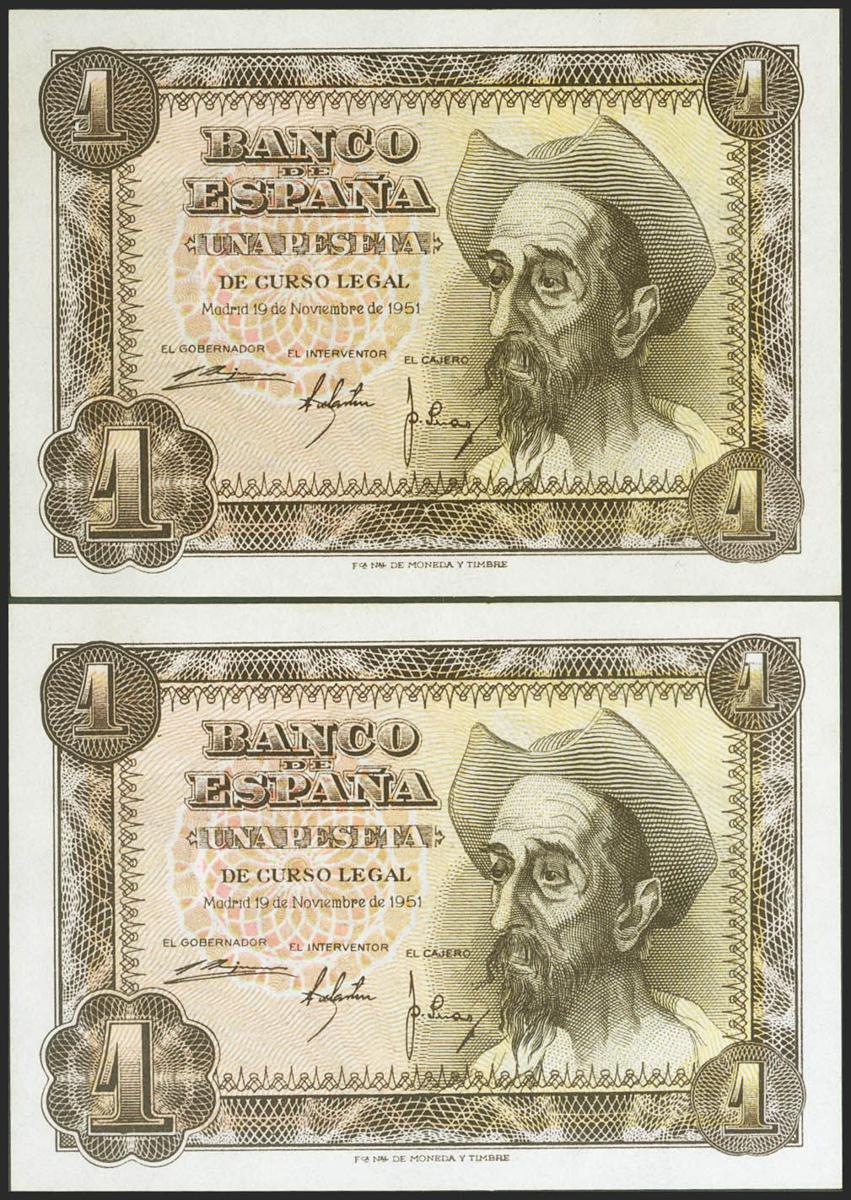 1 Peseta. 19 de Noviembre de 1951. Pareja correlativa. Serie E. (Edifil 2021: 461a). Apresto original. SC-.