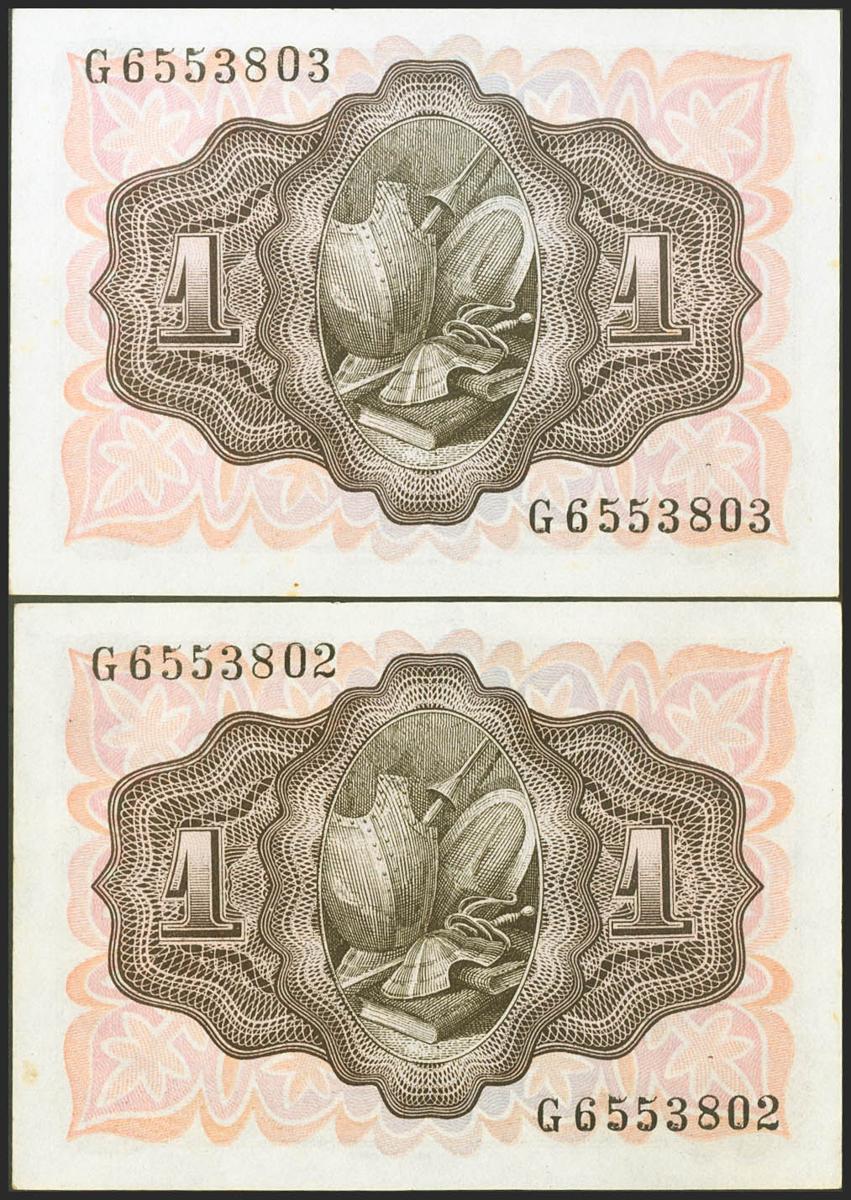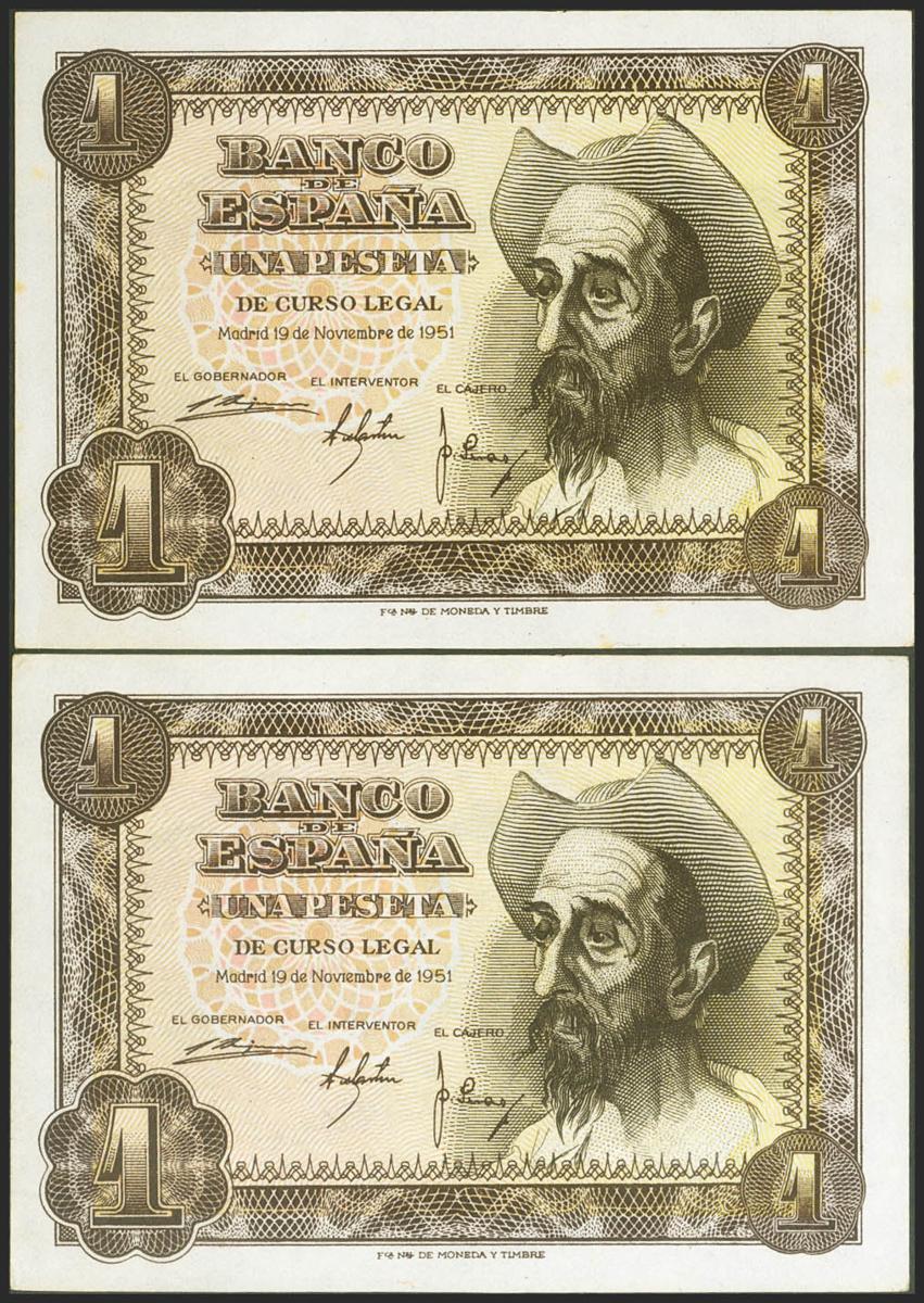 1 Peseta. 19 de Noviembre de 1951. Pareja correlativa. Serie G. (Edifil 2021: 461a). Apresto original. SC-.