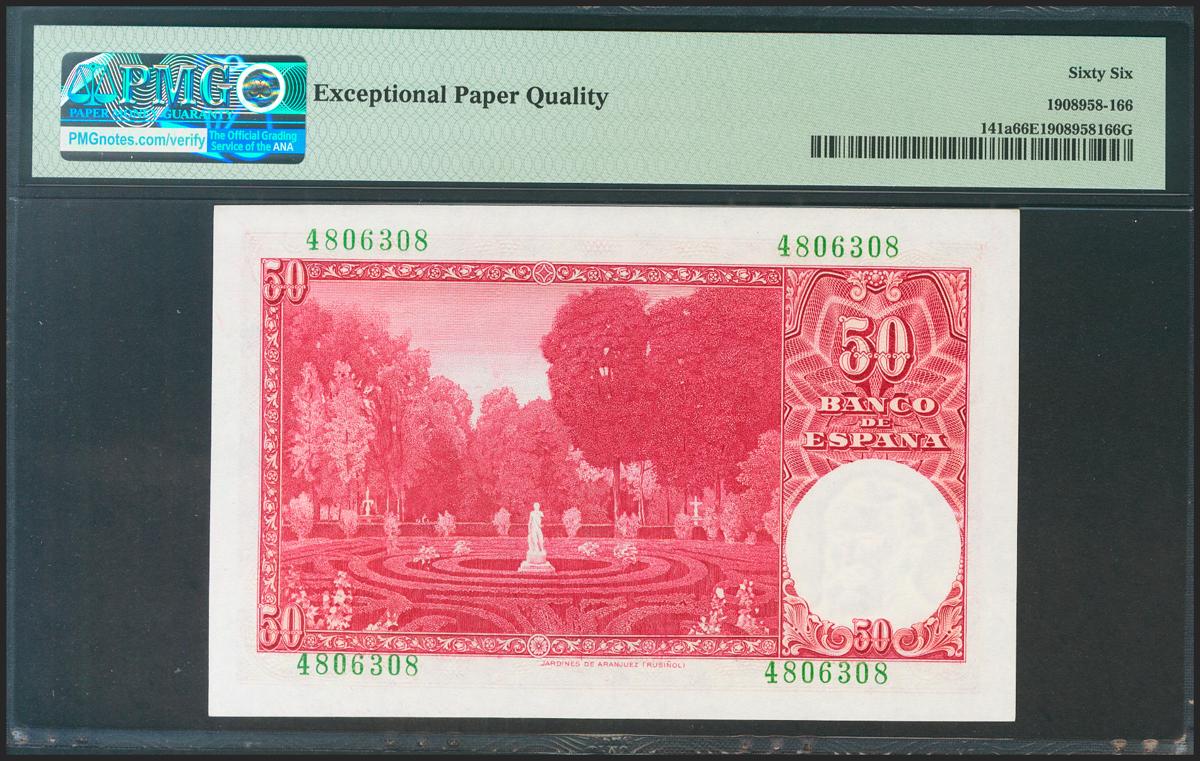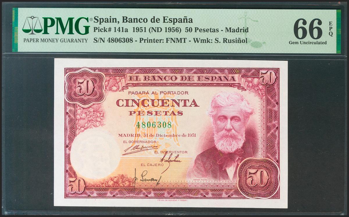 50 Pesetas. 31 de Diciembre de 1951. Sin serie. (Edifil 2021: 462, Pick: 141a). Rarísimo en esta calidad, apresto original. SC. Encapsulado PMG66EPQ.