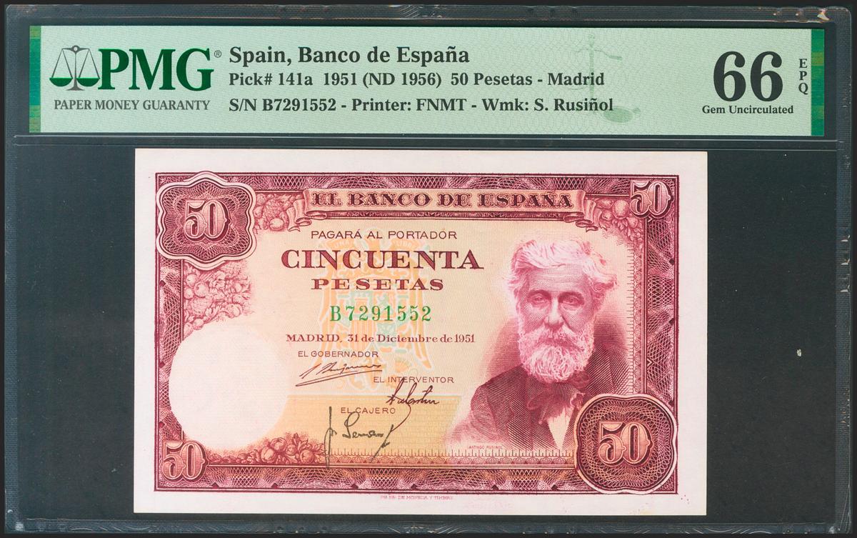 50 Pesetas. 31 de Diciembre de 1951. Serie B. (Edifil 2021: 462a). Rarísimo en esta calidad, conserva todo su apresto original. SC. Encapsulado PMG66EPQ.