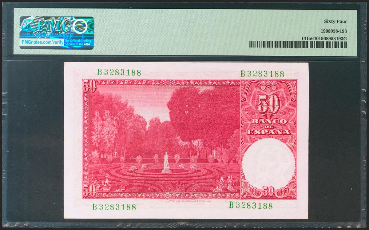 50 Pesetas. 31 de Diciembre de 1951. Serie B. (Edifil 2021: 462a, Pick: 141a). Inusual en esta calidad. SC. Encapsulado PMG64.