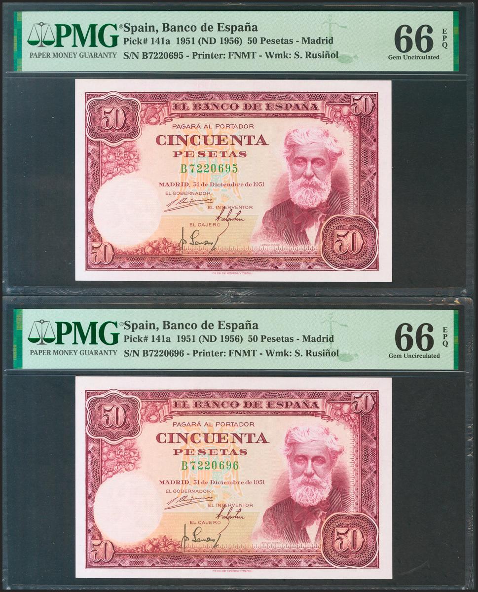 50 Pesetas. 31 de Diciembre de 1951. Pareja correlativa. Serie B. (Edifil 2021: 462a, Pick: 141a). Rarísima en esta calidad, apresto original. SC. Encapsulado PMG66EPQ, ambos.