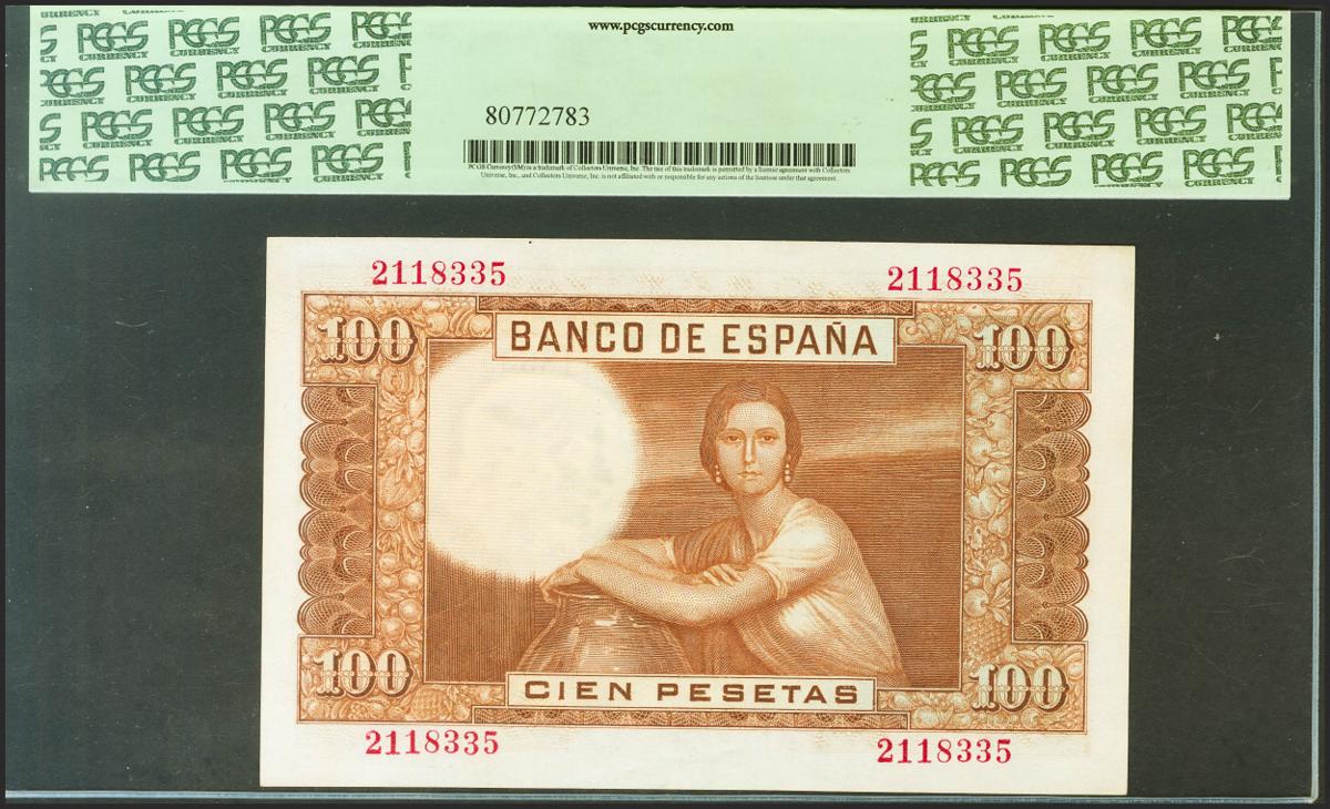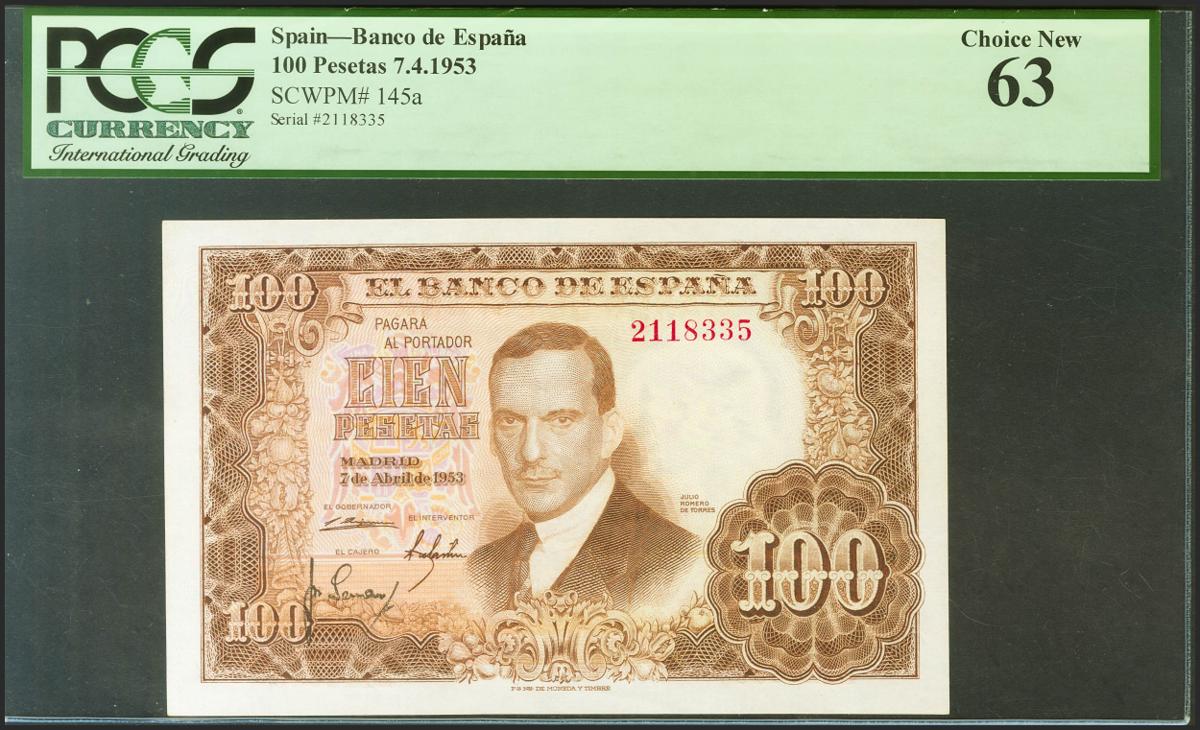100 Pesetas. 7 de Abril de 1953. Sin serie. (Edifil 2021: 464). Inusual. SC. Encapsulado PCGS63.